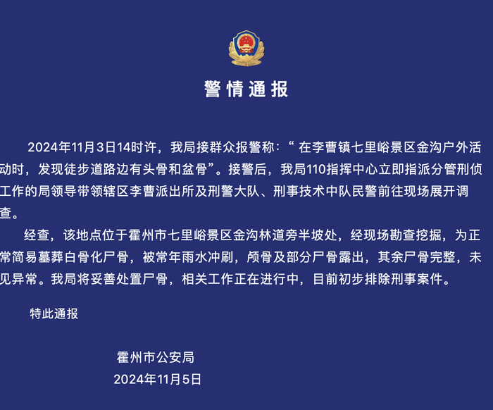 霍州市公安局11月5日发布警情通报:2024年11月3日14时许,该局接群众报警称,在李曹镇七里峪景区金沟户外活动时,发现徒步道路边有头骨和盆骨。经查,该地点位于霍州市七里峪景区金沟林道旁半坡处,经现场勘查挖掘,为正常简易墓葬白骨化尸骨,被常年雨水冲刷,颅骨及部分尸骨露出,其余尸骨完整,未见异常。该局表示将妥善处置尸骨,相关工作正在进行中,目前初步排除刑事案件。