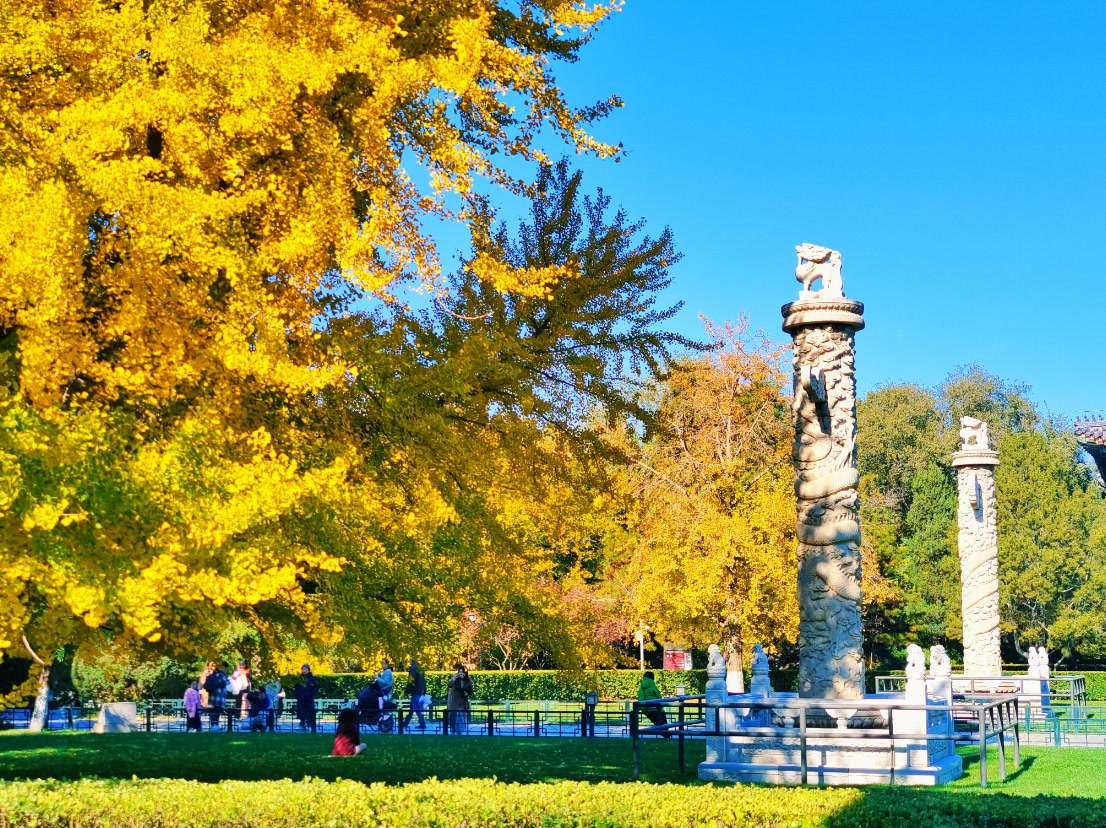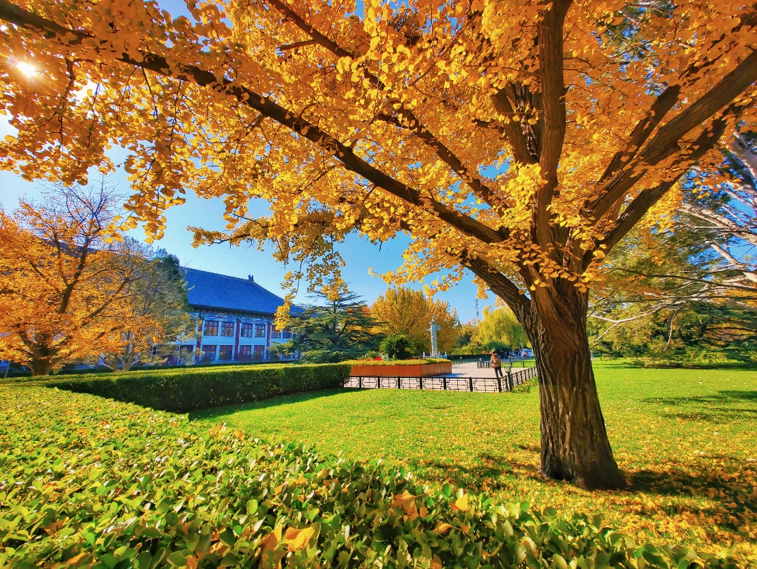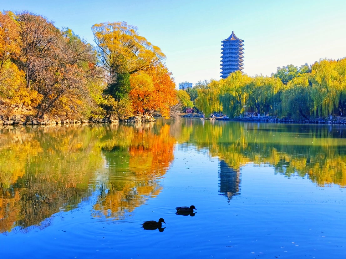 北京大学校园秋色如画,博雅塔巍然矗立,被火红的枫叶轻轻掩映,仿佛披上了一层绚烂的红纱。金灿灿的银杏叶铺满小径,将古老的华表环抱其中,闪耀着温暖而耀眼的光芒。学子们徜徉在这如诗如画的景致中,享受着这份宁静与美好,仿佛与这秋日的北大融为一体,共同编织着属于他们的青春记忆。