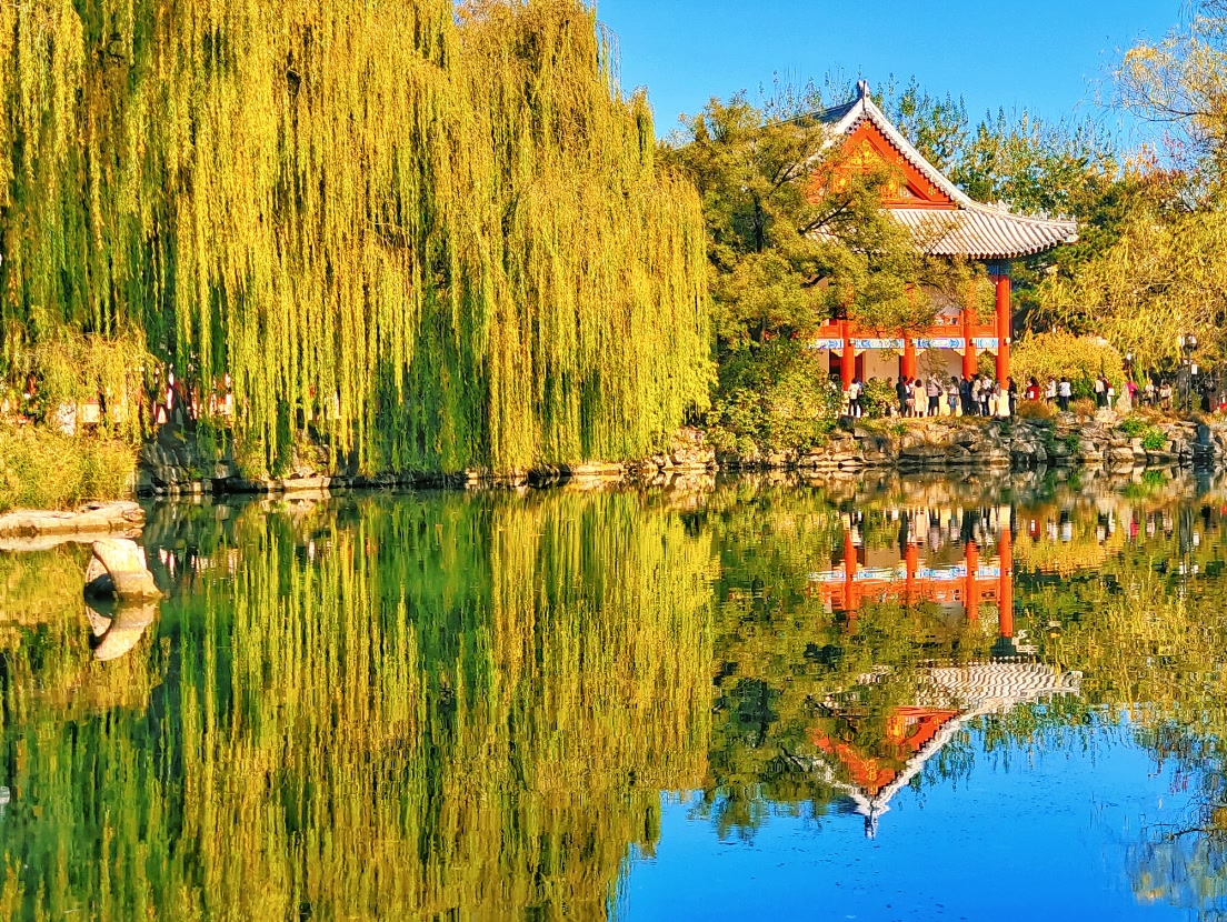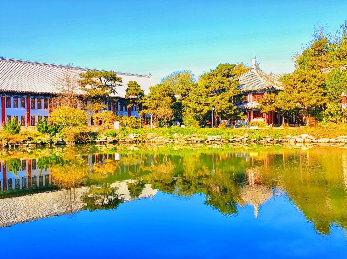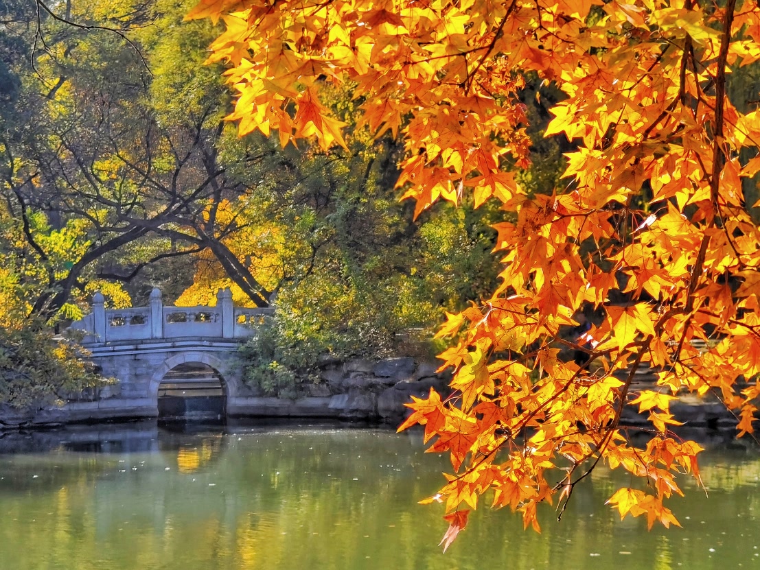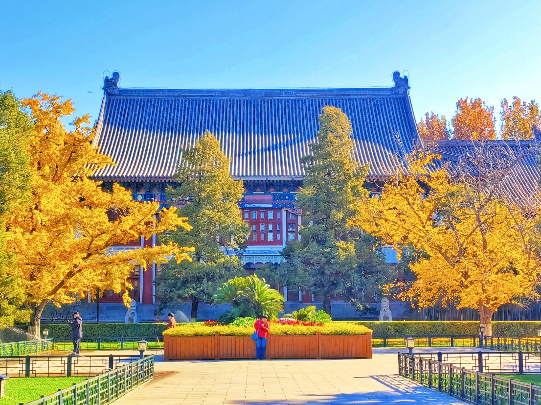 北京大学校园秋色如画,博雅塔巍然矗立,被火红的枫叶轻轻掩映,仿佛披上了一层绚烂的红纱。金灿灿的银杏叶铺满小径,将古老的华表环抱其中,闪耀着温暖而耀眼的光芒。学子们徜徉在这如诗如画的景致中,享受着这份宁静与美好,仿佛与这秋日的北大融为一体,共同编织着属于他们的青春记忆。