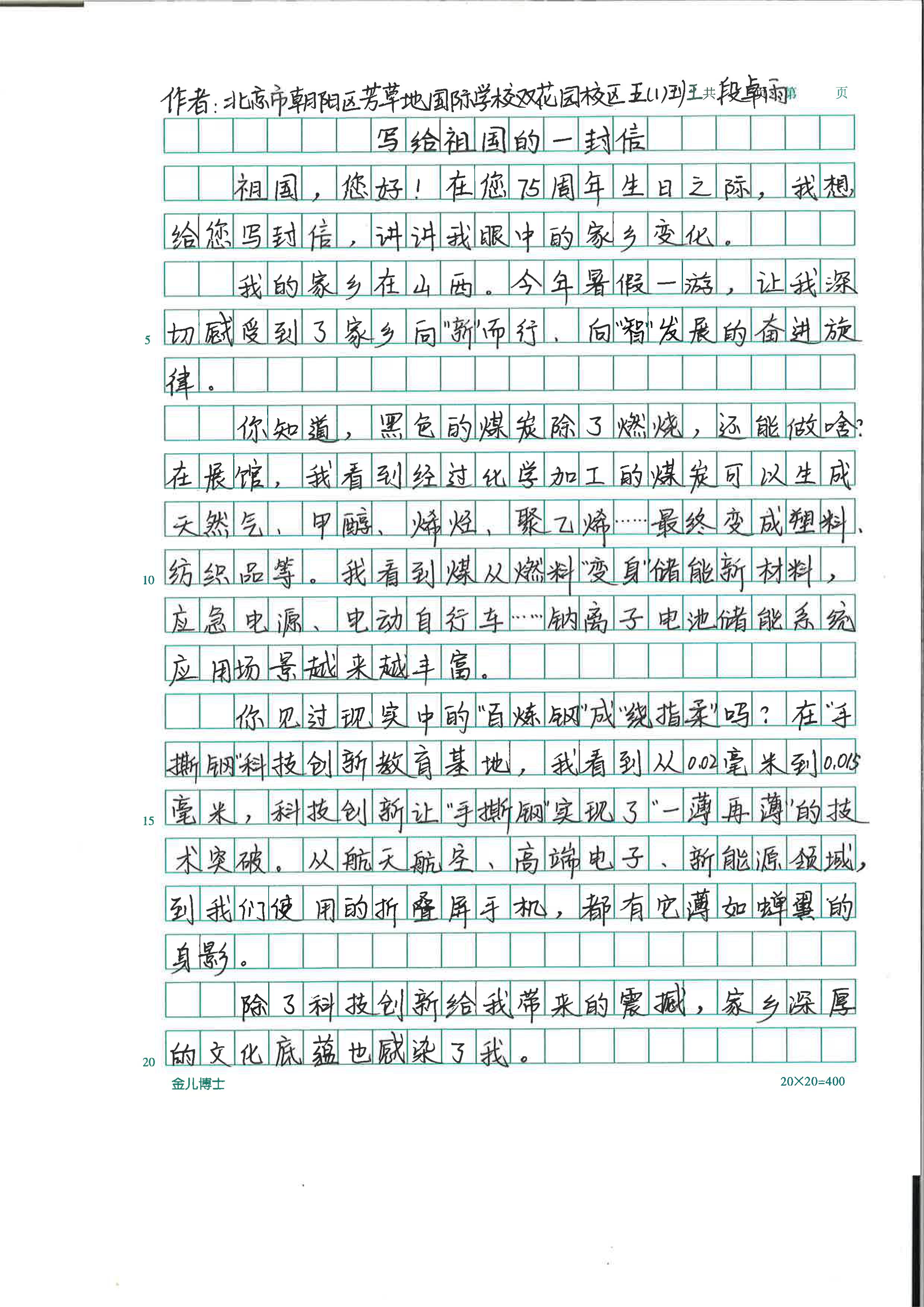 今天这幅AI绘画作品的原型来自芳草地国际学校双花园校区五年级(1)班段卓雨的书信作品《写给祖国的一封信》。
