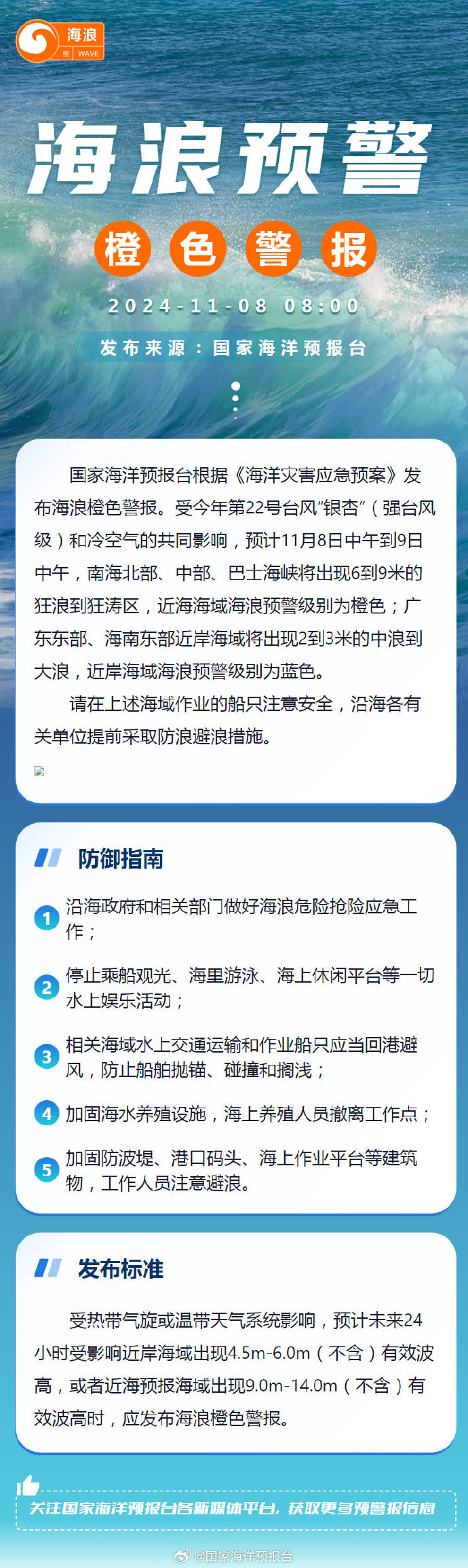 国家海洋预报台根据《海洋灾害应急预案》发布海浪橙色警报。受今年第22号台风“银杏”(强台风级)和冷空气的共同影响,预计:11月8日中午到9日中午,南海北部、中部、巴士海峡将出现6到9米的狂浪到狂涛区,近海海域海浪预警级别为橙色;广东东部、海南东部近岸海域将出现2到3米的中浪到大浪,近岸海域海浪预警级别为蓝色。请在上述海域作业的船只注意安全,沿海各有关单位提前采取防浪避浪措施。48小时预报:11月9日中午到10日中午,南海北部、中部将出现6到9米的狂浪到狂涛区,近海海域海浪预警级别为橙色;广东、海南东部近岸海域将出现2.5到3.5米的大浪,近岸海域海浪预警级别为黄色。72小时预报:11月10日中午到11日中午,南海北部、中部将出现6到9米的狂浪到狂涛区,近海海域海浪预警级别为橙色;广东西部、海南东部海域将出现3到4.4米的大浪到巨浪,近岸海域海浪预警级别为黄色。
