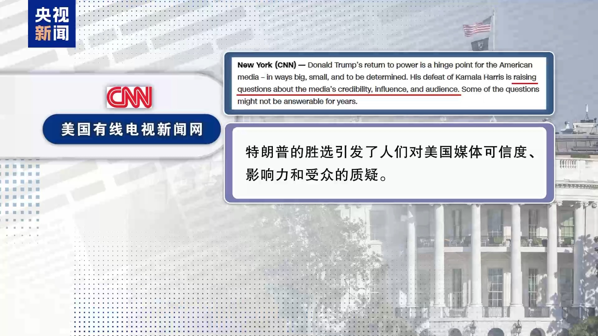 亲民主党的美国有线电视新闻网网站6日刊发了一篇评论文章说,特朗普的胜选引发了人们对美国媒体可信度、影响力和受众的质疑。