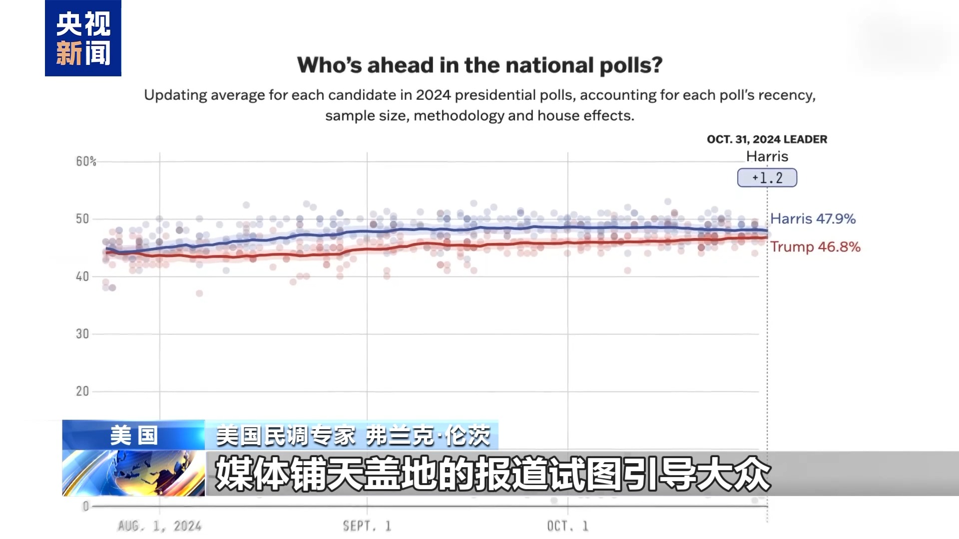 美国彭博电视台主持人:在整个选举周期,我们都在谈论双方势均力敌。可在绝大多数“战场州”,结果并非如此。
