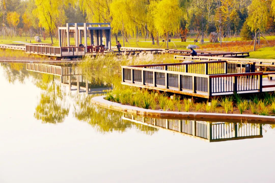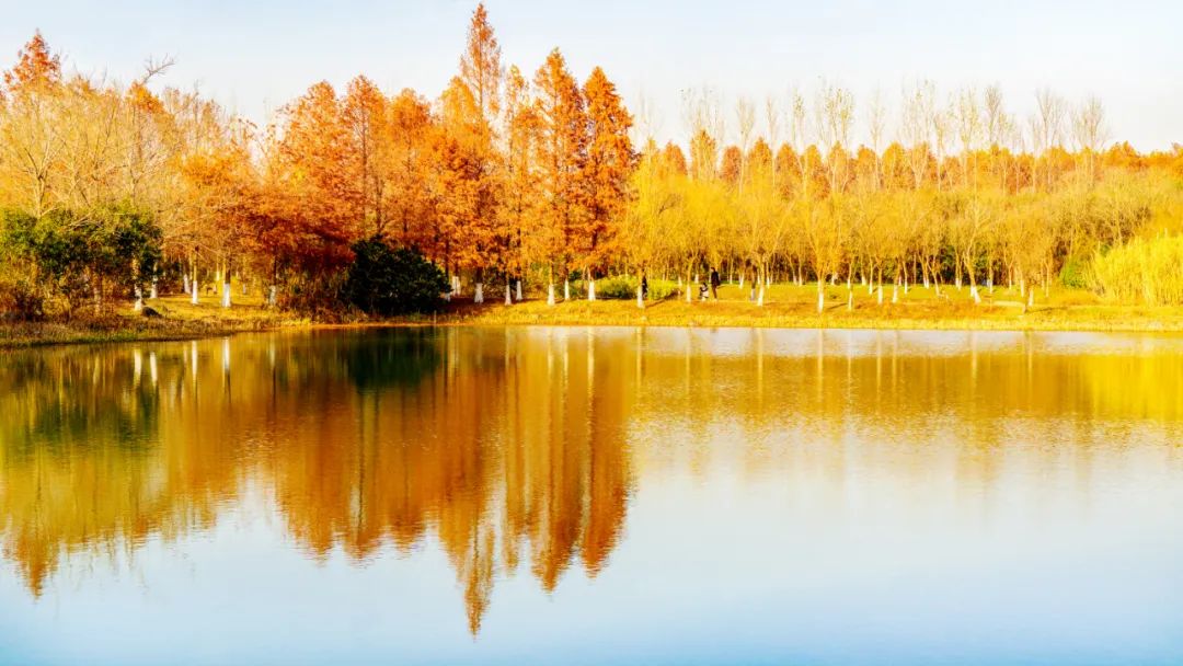何里栖地公园内,秋水共长天一色,湖面如镜,倒映岸边五彩树木,秋风拂过,泛起层层涟漪,落叶在水面轻轻摇曳。