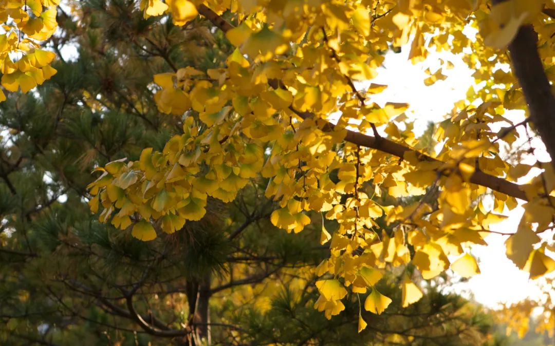 金黄的银杏叶,如一把把小巧的扇子,随风摇曳,洒落一地的金黄。
