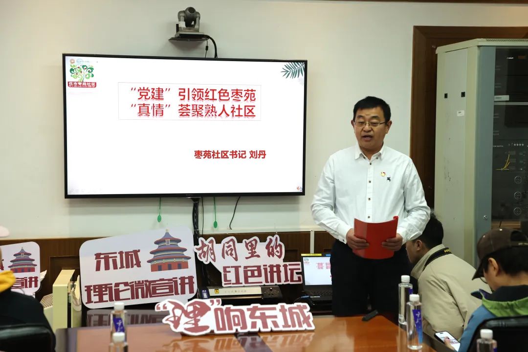东花市街道花市枣苑社区党委书记刘丹以《党建引领红色枣苑 真情荟聚熟人社区》为题作主题宣讲,他用最美酸枣树下的故事,展现不断破解基层治理难点痛点、逐步打造的熟人社区治理模式。