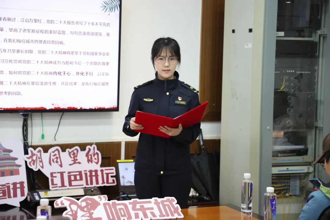 街道青年干部马琳以《笃定实干勇担青春使命》为主题,讲述她走出校园,走进基层,作为一名东城城管新人的拼搏故事。