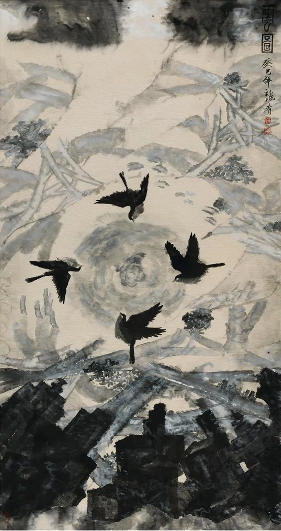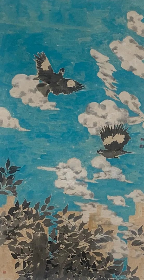 孟张龙的作品气质宁静,将中国画的写意与诗意相邂逅,特别是他作品中以俯瞰视角描绘飞鸟在城市、高山、田野上空自由翱翔,是他对诗意栖居理想状态的追求,体现出他深受中国传统哲学的影响。