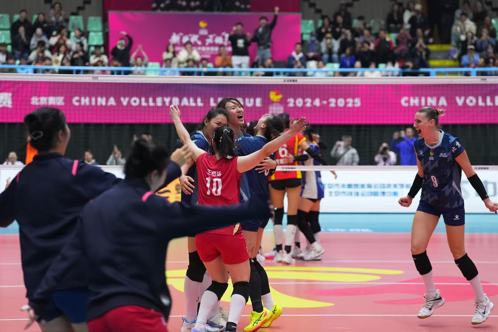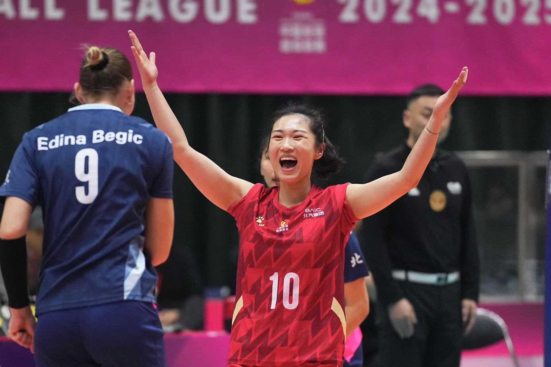决胜局,双方拼到最后一刻,用完了全部暂停。北汽女排在对手获得赛点的情况下,依靠强力拦网连续得分,以17比15击败对手,取得三连胜。