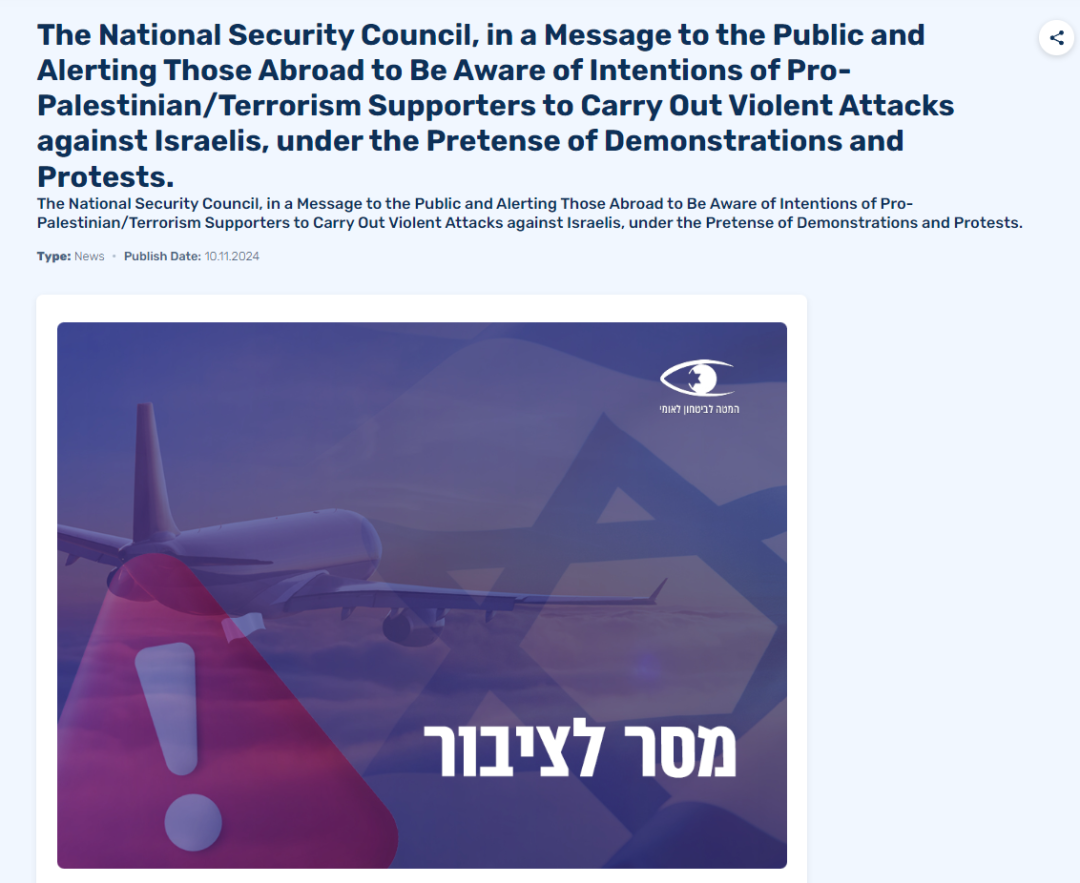 当地时间11月10日,以色列国家安全委员会发布国外旅行警告,提醒以色列公民在海外尽量避免暴露自己的国籍和族裔,以免引发安全问题。