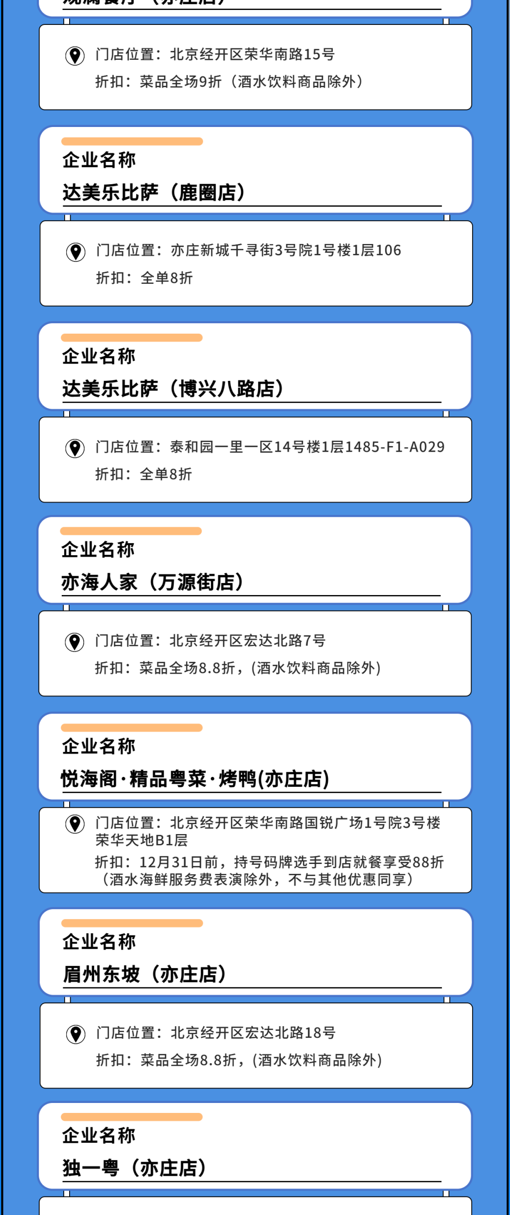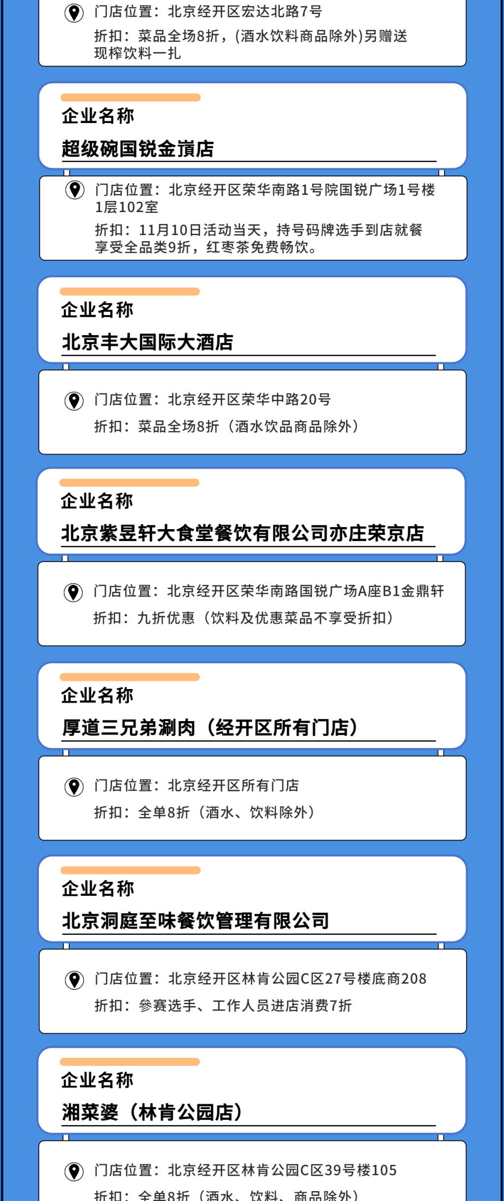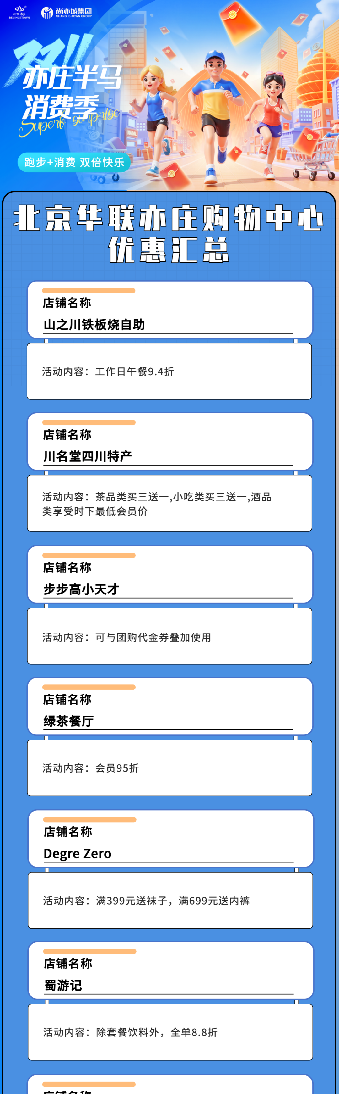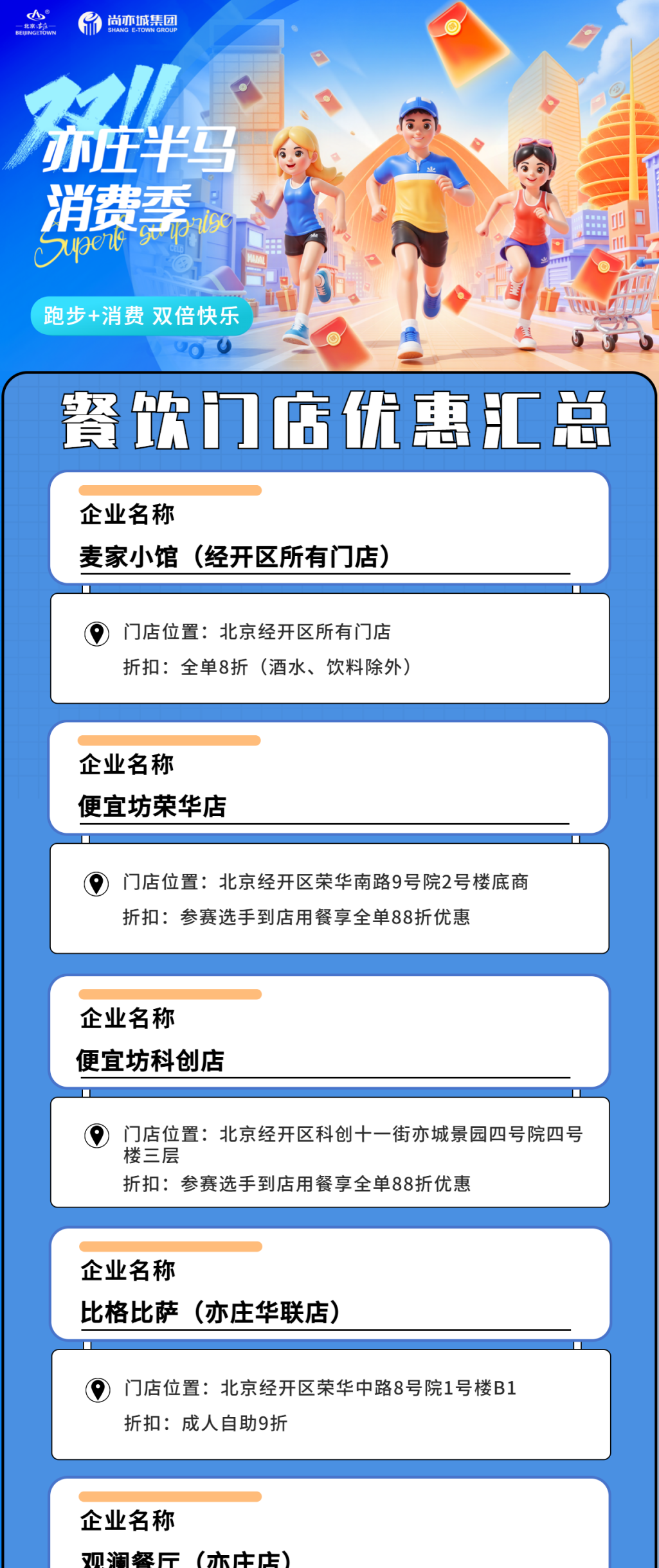 除了全民大额消费券、全民消费券、马拉松跑者消费券3类消费券带来的满减优惠外,在11月9日至12日消费券活动期间,北京经开区各大商圈、特色商户和消费新场景也集中推出一系列自有促销优惠,以满减优惠、打折促销、赠送礼品等“折上折”方式,与消费券进行联动,让消费者不用比价做攻略,即可享受众多福利和超值回馈,一同“乐购亦城”!