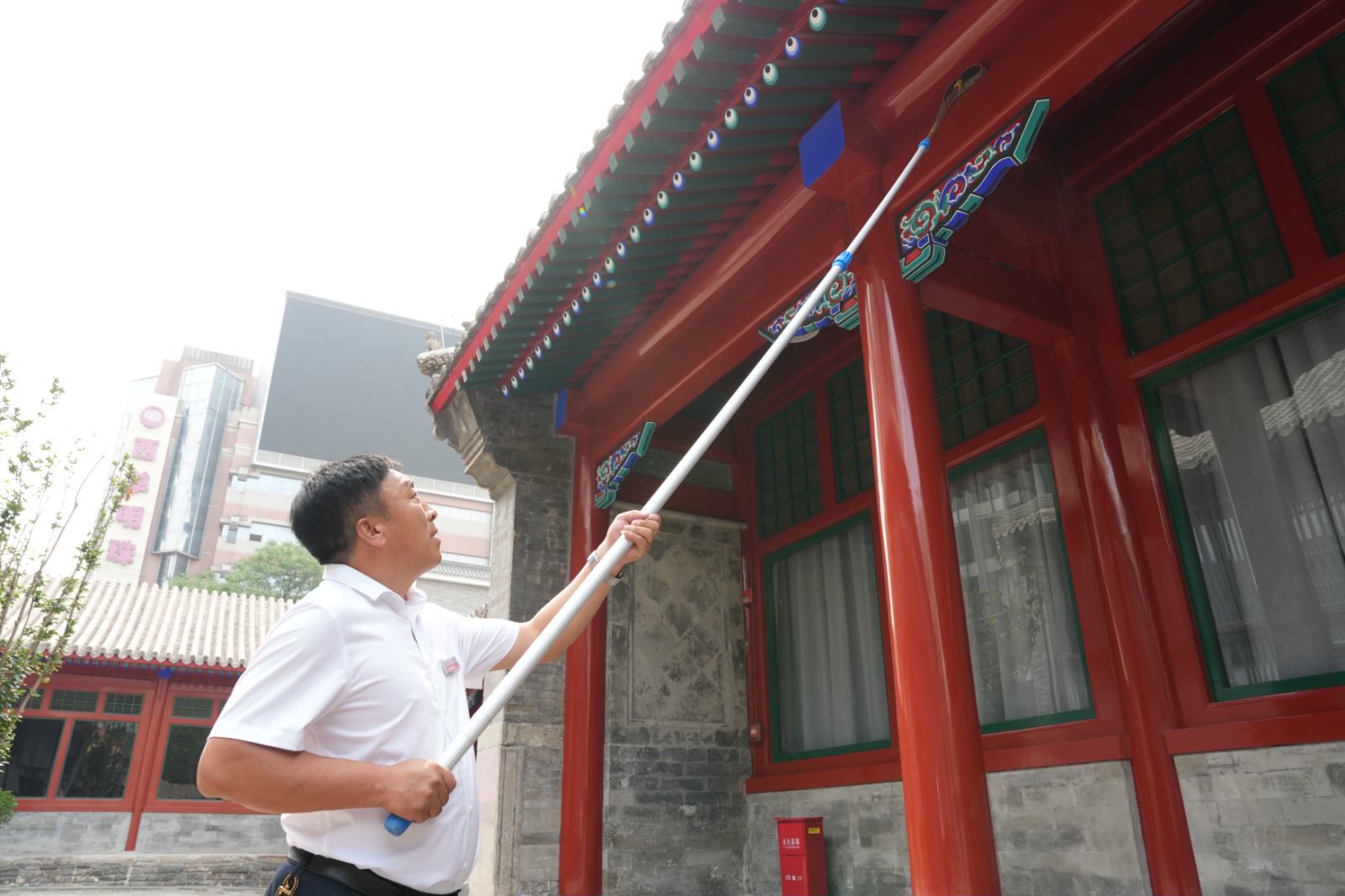 保洁主管吴殿华在入场前已经设计好了保洁方案。屋顶、柱梁的高处清洁使用加强伸缩杆,他还请尚在收尾阶段的施工团队帮忙特制了一些工具,比如把伸缩杆上的刷头由直刷改造成弧形,弧度刚好能围绕柱子。为避免剐蹭划伤,吴殿华要求保洁人员把三层毛巾包裹在刷头上,毛巾介于半潮湿至微干之间的状态,清洗毛巾也尽量不使用任何化学洗涤剂,只用清水处理。吴殿华介绍,给古代建筑做保洁颇为耗时费力,因为很多常用清洁设备都无法使用,只能是人工手动,在细处下功夫。比如房屋的玻璃窗户大多是用木条分割成的小窗格拼接而成的,保洁常用的玻璃刮刷全无用武之地,窗格都得用手一块块擦抹干净。