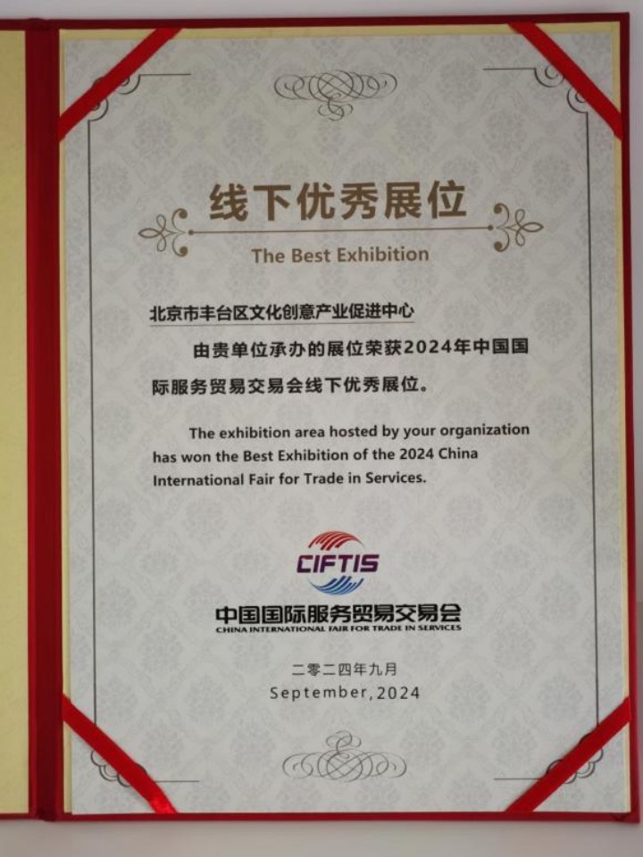 2024年9月,由区文创中心精心组织筹办的“五气连枝 丰宜福台”主题展亮相服贸会文旅专题展并取得圆满成功,经服贸会组委会组织评定,文旅服务专题丰台展区获评线下优秀展位荣誉。