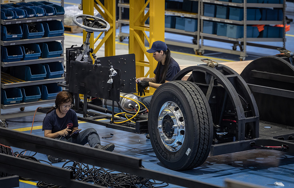 巴西圣保罗州,工人们在比亚迪工厂组装电动巴士底盘。(视觉中国)