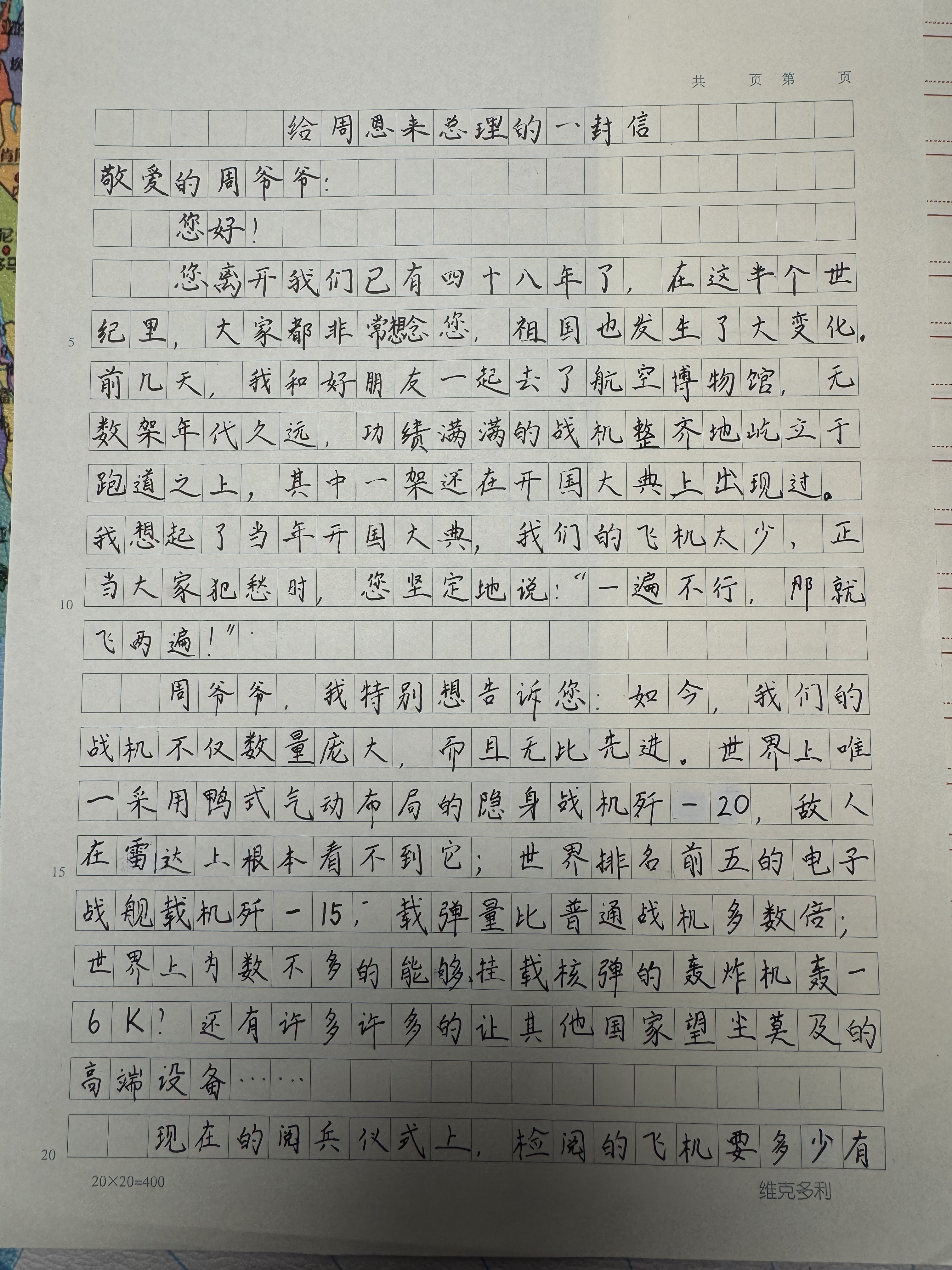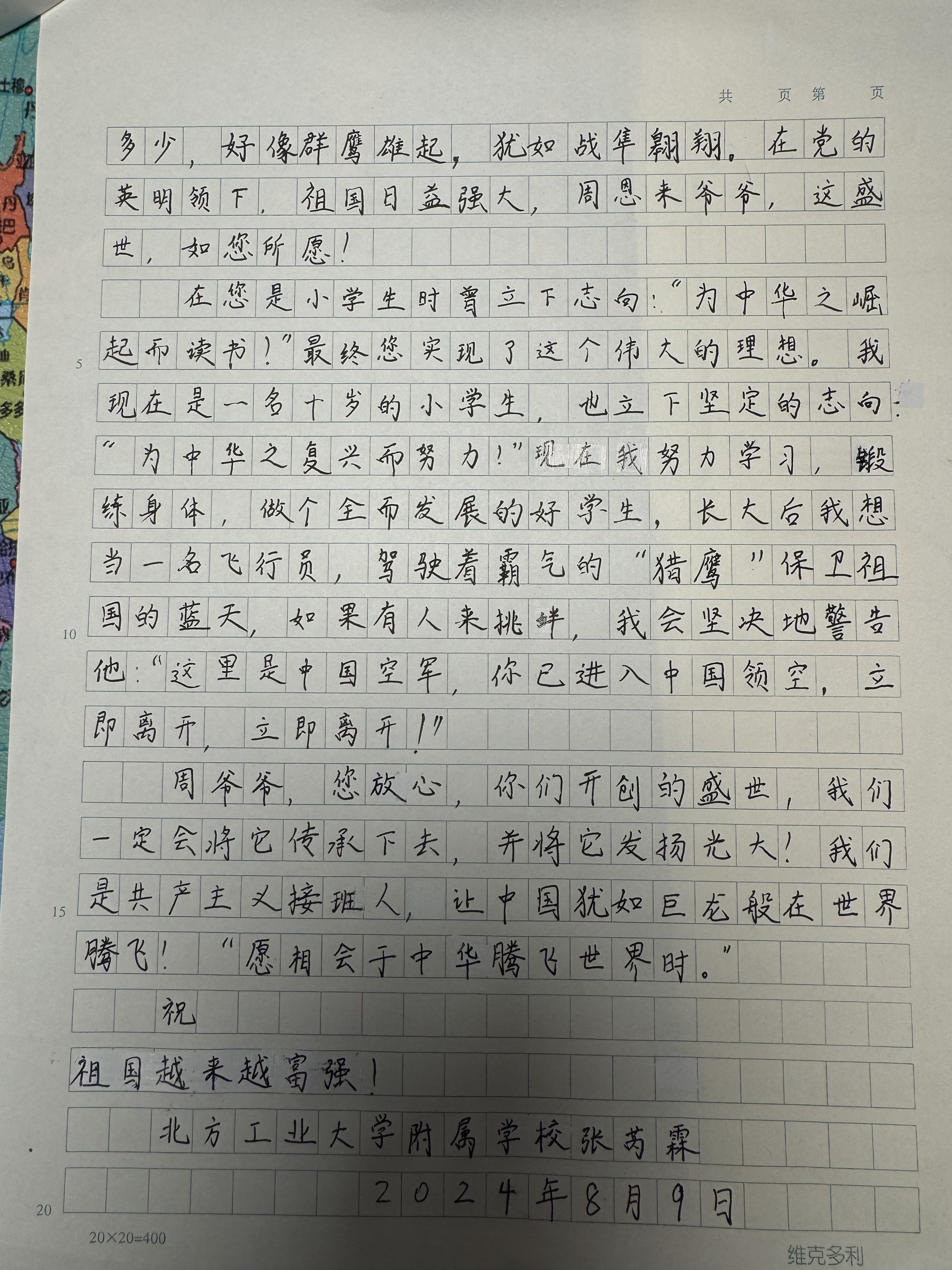 今天这幅AI绘画作品的原型来自北方工业大学附属学校(小学部)五年级(1)班张芮霖的书信作品《给周恩来总理的一封信》。