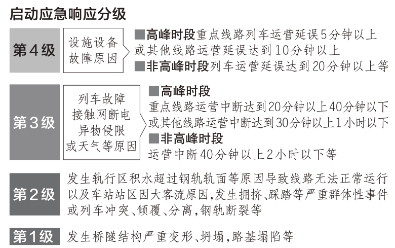 昨天,市交通委发布《北京市轨道交通运营突发事件应急预案(2024年修订)》。预案根据事件严重程度和发展态势,将应急响应分为四级,并视情扩大响应,并规定每一级响应的启动条件和指挥调度。