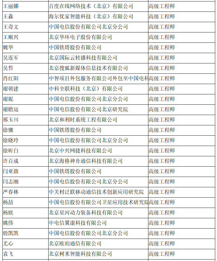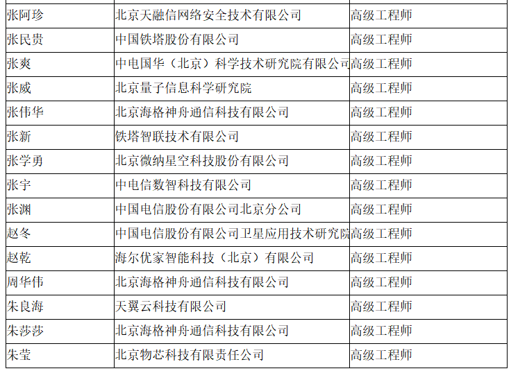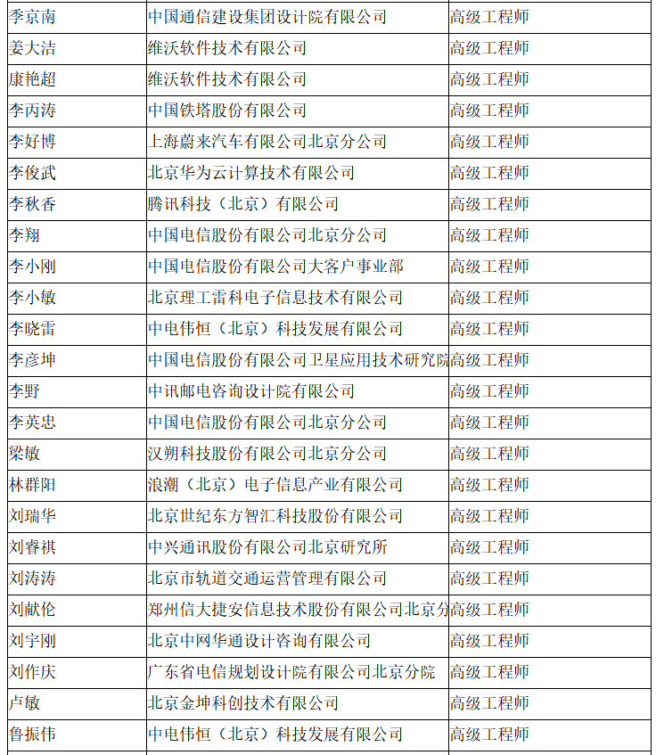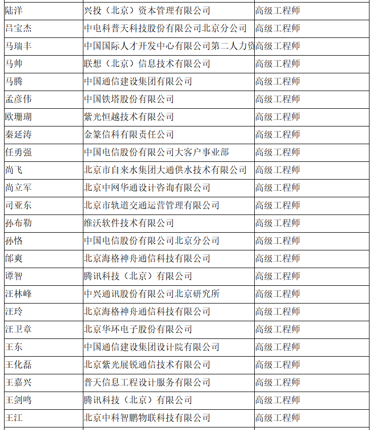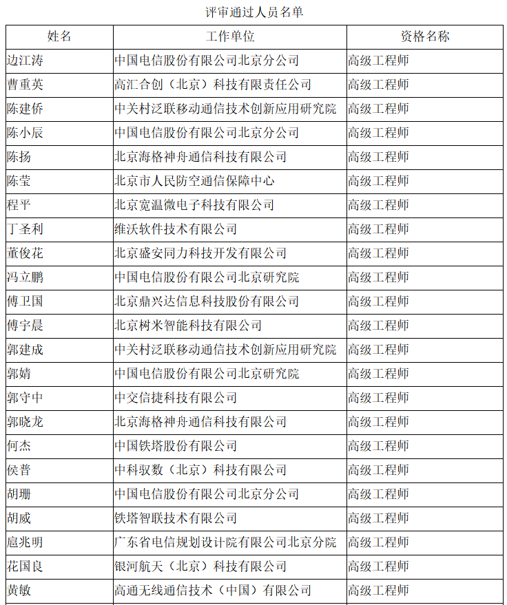 北京市工程技术系列(通信)高级专业技术资格评审委员会于2024年11月7日召开会议,边江涛等111人(名单附后)通过了高级工程师专业技术资格评审。根据《北京市职称评审管理暂行办法》(京人社事业发〔2020〕12号)的规定,经复核,现予以公示。
