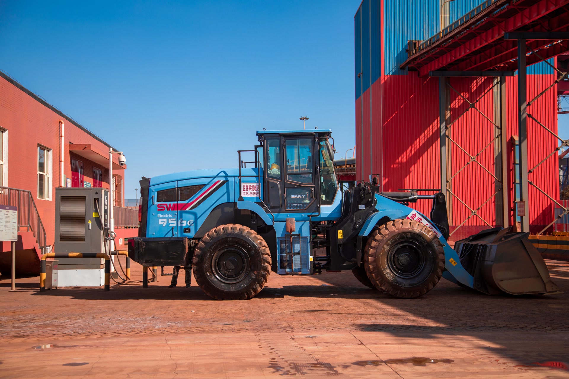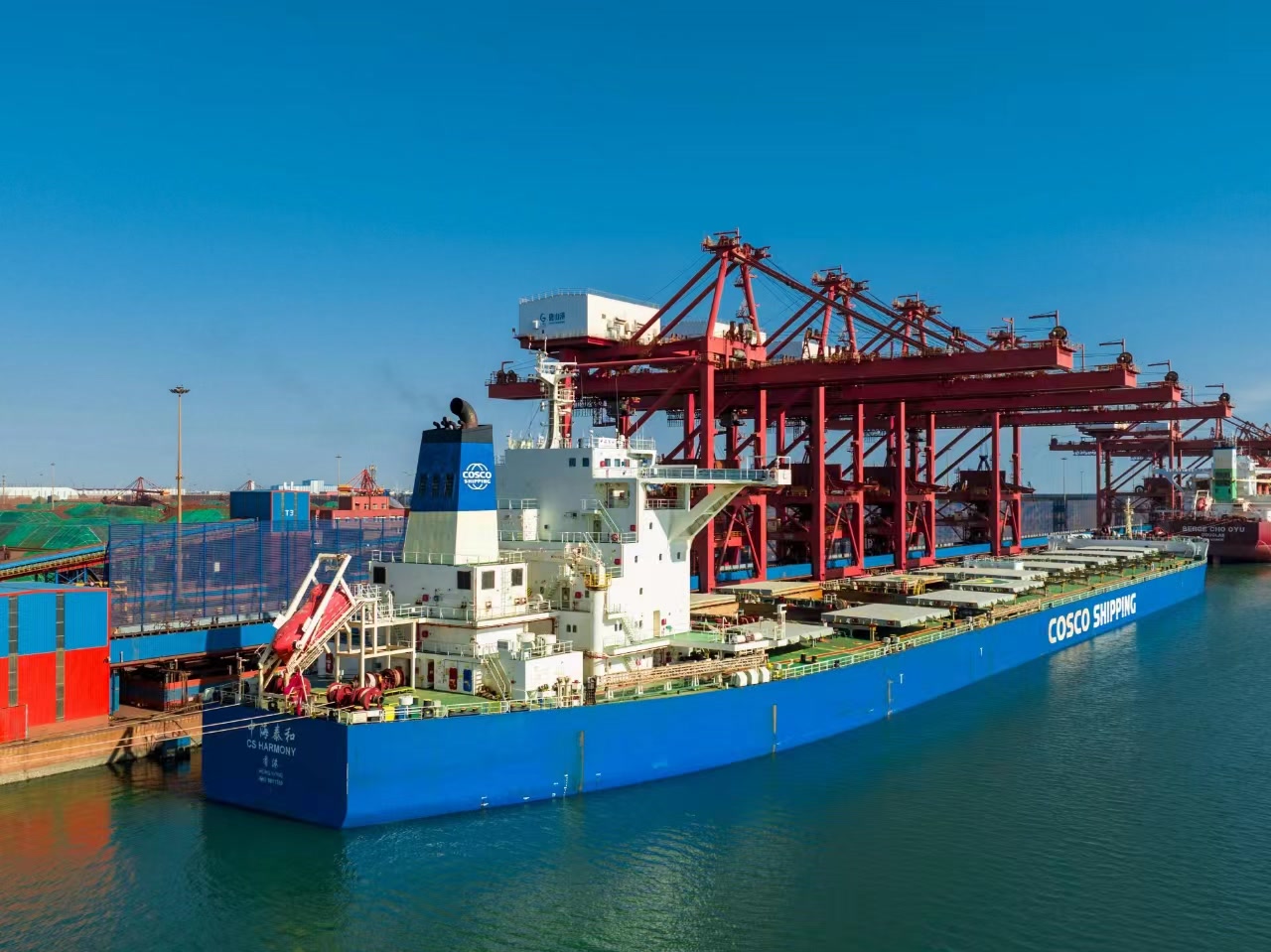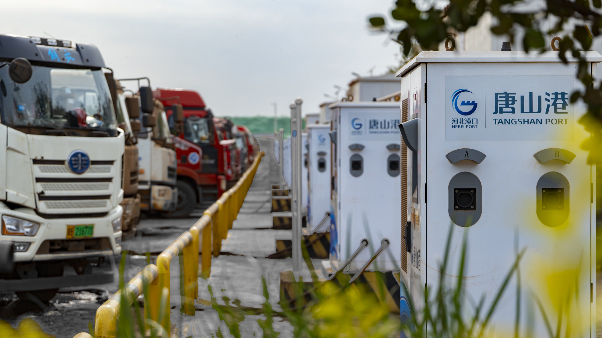 河北港口集团唐山港京唐港区矿石码头作业区内,一艘20万吨巨轮平稳停靠在矿石码头“矿2”泊位;电动铲车配合新能源重卡装载着来自世界各地的矿石疏港;重卡疏港车辆驶向附近的钢厂企业……