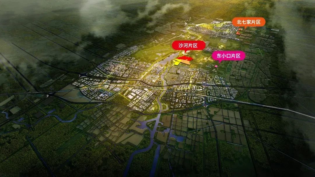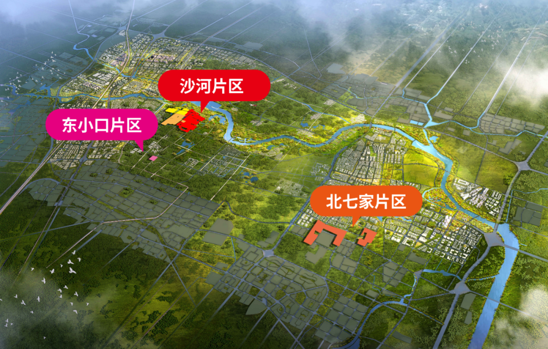 总体来看,沙河片区一期、二期、三期连成一个整体,并与已建成的沙河湿地公园联为一体,构成现状定泗路以北内容丰富、功能完备的公园体系。沙河片区全部位于未来科学城规划范围内,联结着未来科学城西区和生态绿心。北七家片区(一期)分为两个地块,其中东部地块位于未来科学城东区,西部地块从未来科学城南部开始向南延伸到科学城以南地区。