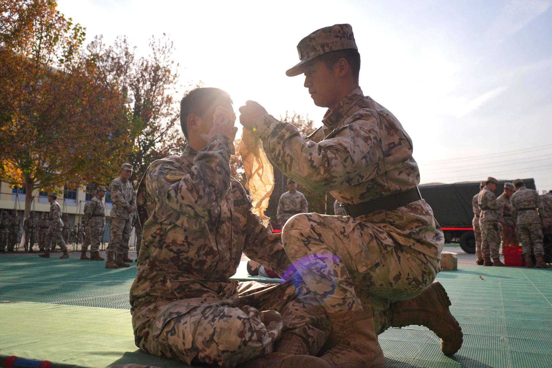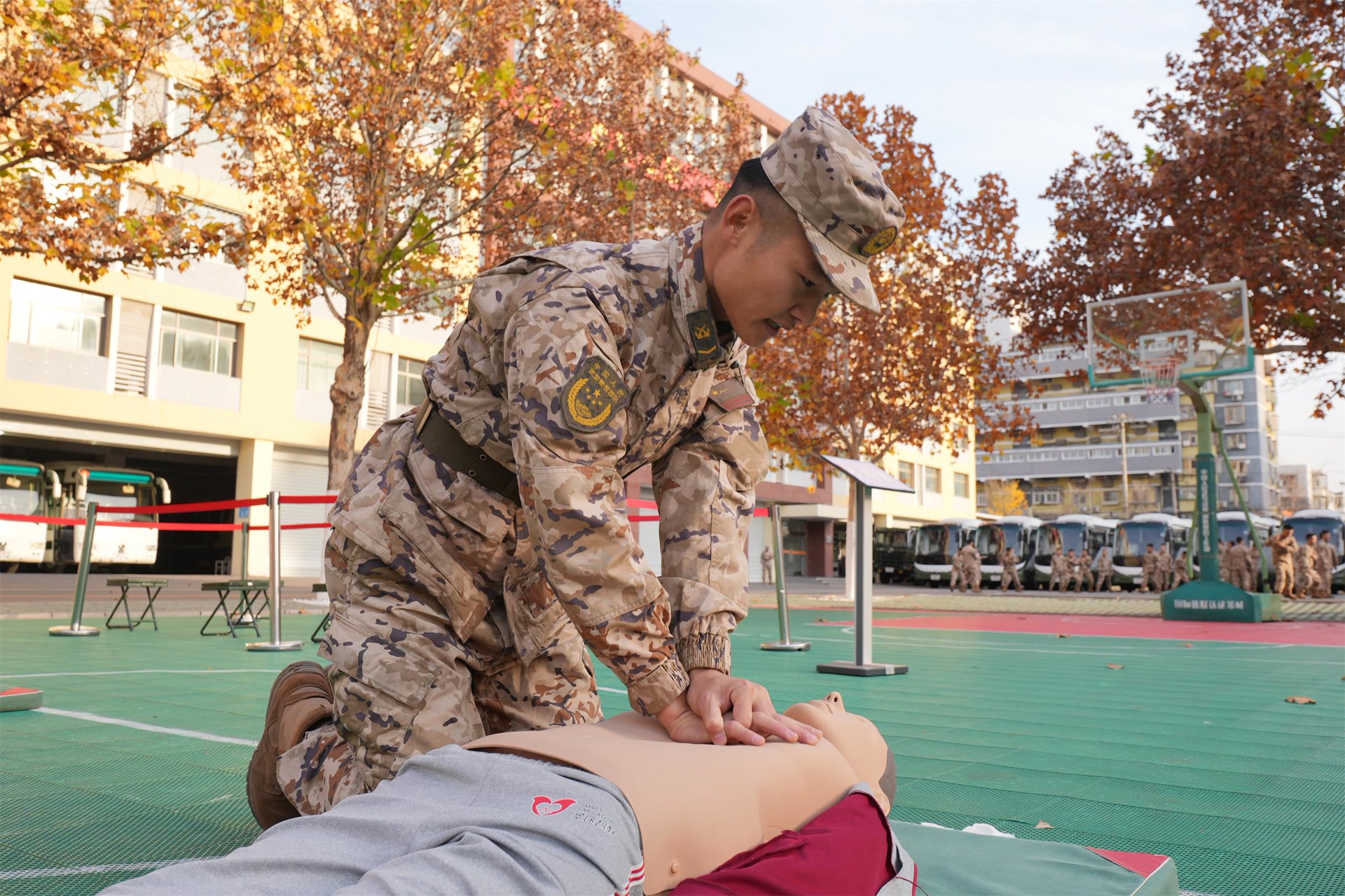 “前方发现一名伤员,周围环境安全,立即抢救……”在卫生员比武现场,参赛选手上演着战场救护“生死时速”,止血、包扎、固定、搬运,一气呵成,筑牢“生命之墙”。