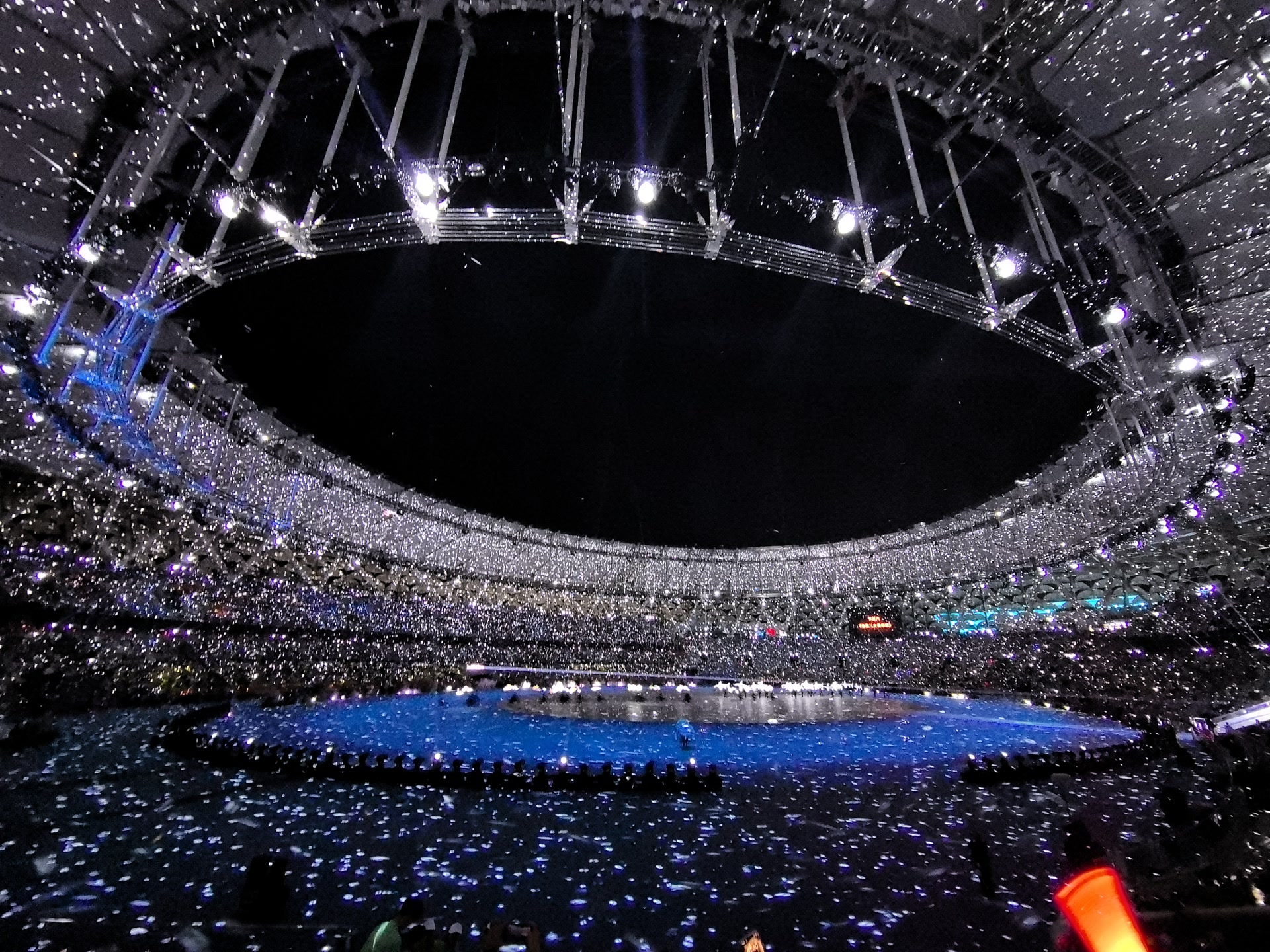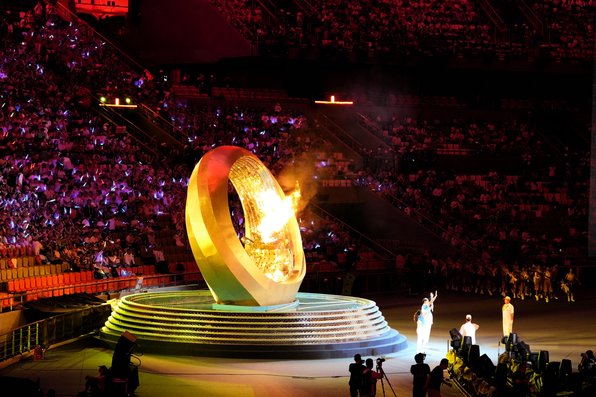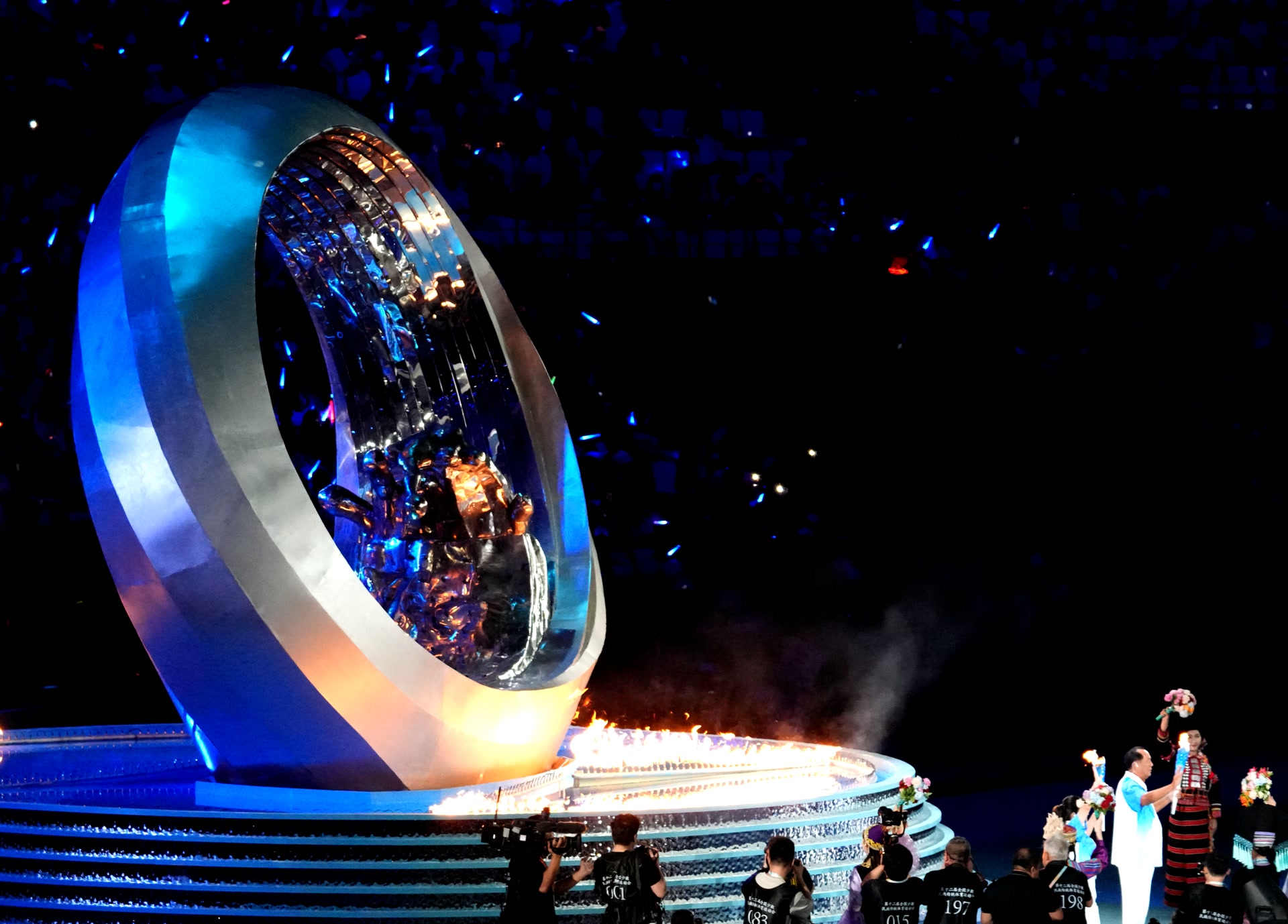 运动会开幕式上的火炬塔也很特别。“我们摒弃了以往高高火炬塔的样子,把它上升为一个圆形的艺术装置。它既是一个圆,构成多维立体的‘民族同心圆’,然后里面刻了12圈纹路,寓意运动会走过了12届的历程。”开闭幕式总制作人吴艳解释。