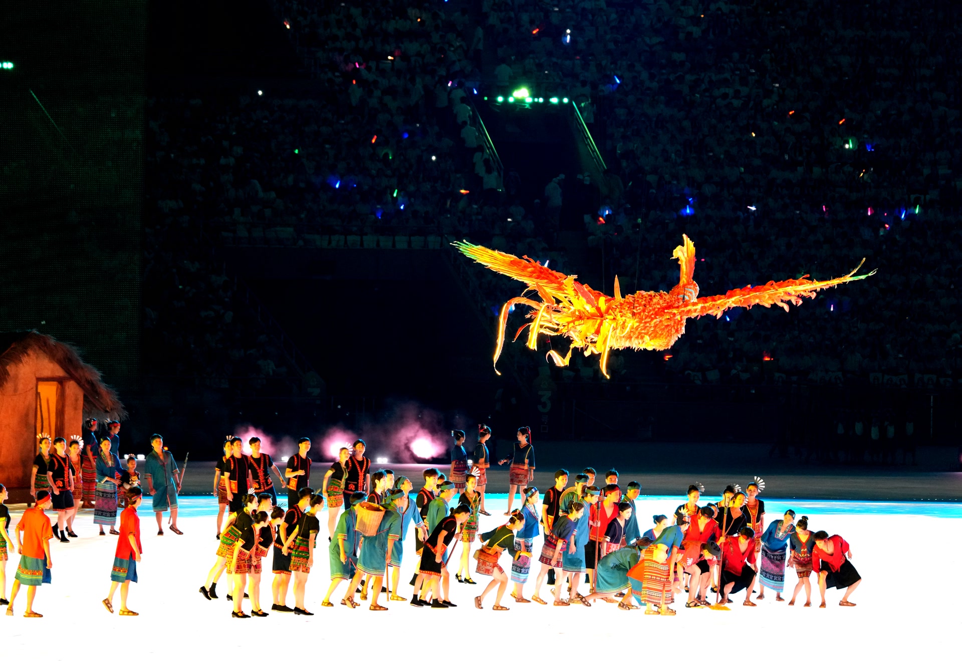 为了更好地展现56个民族的风貌,表达“铸牢中华民族共同体意识”理念,主创团队精心构思,选择用盛大的舞蹈阵列与各民族生活场景相结合的方式进行创作。“比如演出节目《融情汇聚》,聚焦中华锦、绣,以黎锦、云锦、壮锦、苏绣、湘绣、京绣、蜀绣、粤绣等各民族各地方的‘锦绣’作为主题表达,关联出各民族服饰、特色舞蹈的展现。”开闭幕式总导演丁伟介绍。