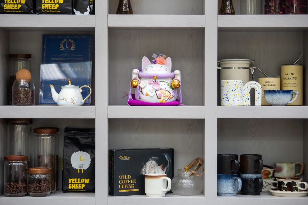 橱窗里摆放着来自世界各地的咖啡豆☕
