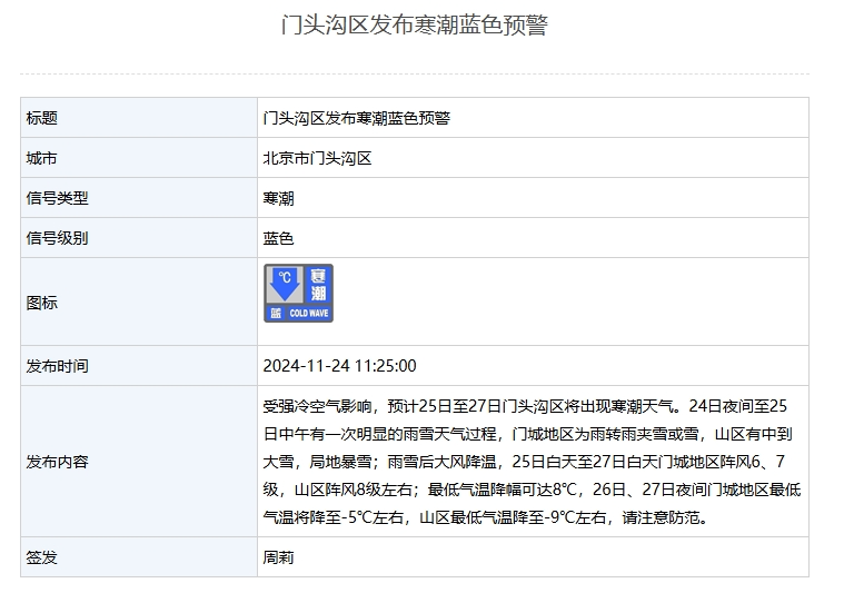 门头沟区气象台11月24日11时25分发布寒潮蓝色预警:受强冷空气影响,预计25日至27日门头沟区将出现寒潮天气。24日夜间至25日中午有一次明显的雨雪天气过程,门城地区为雨转雨夹雪或雪,山区有中到大雪,局地暴雪;雨雪后大风降温,25日白天至27日白天门城地区阵风6、7级,山区阵风8级左右;最低气温降幅可达8℃,26日、27日夜间门城地区最低气温将降至-5℃左右,山区最低气温降至-9℃左右,请注意防范。