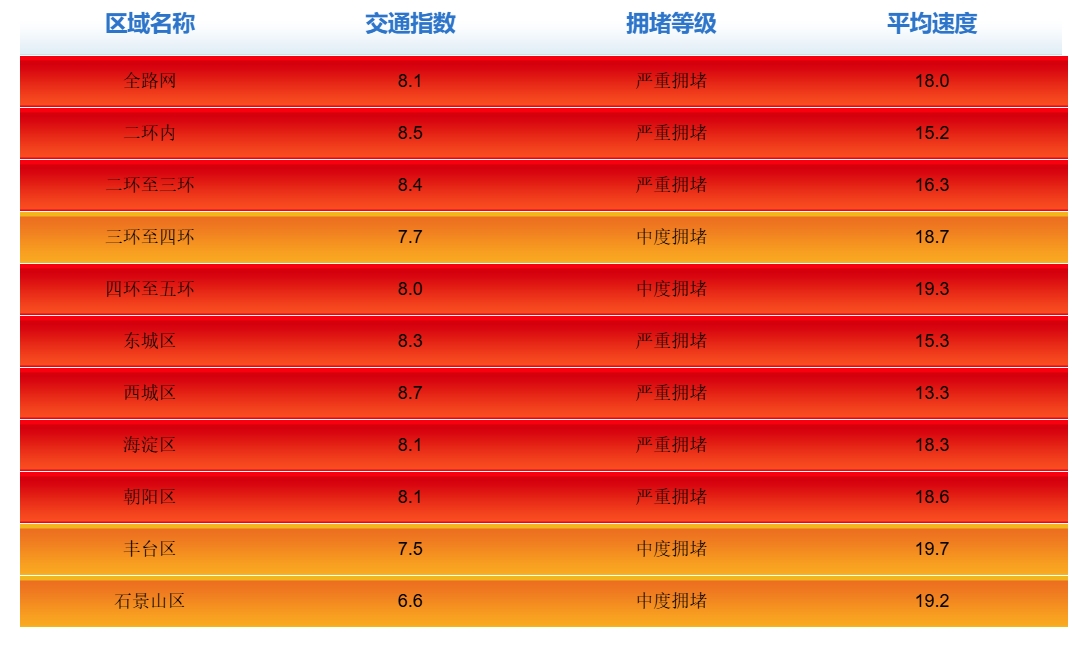 北京交通刚刚达到严重拥堵级别,看看哪最堵?
