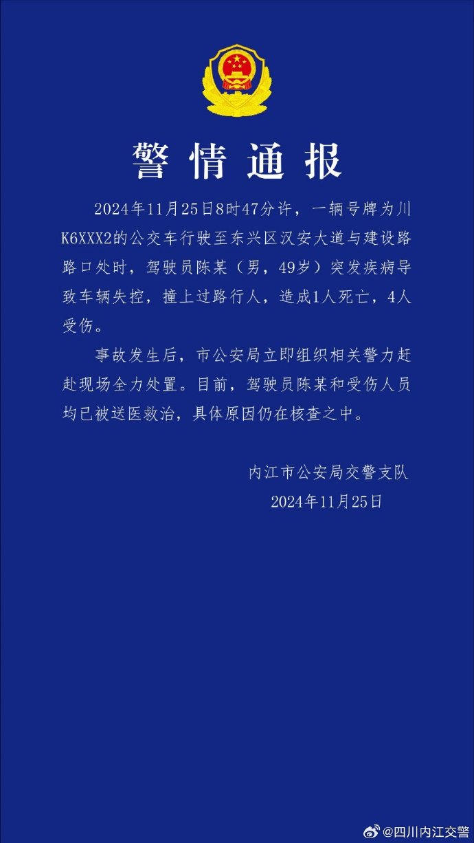 四川内江一公交车司机突发疾病致车辆失控,造成1死4伤