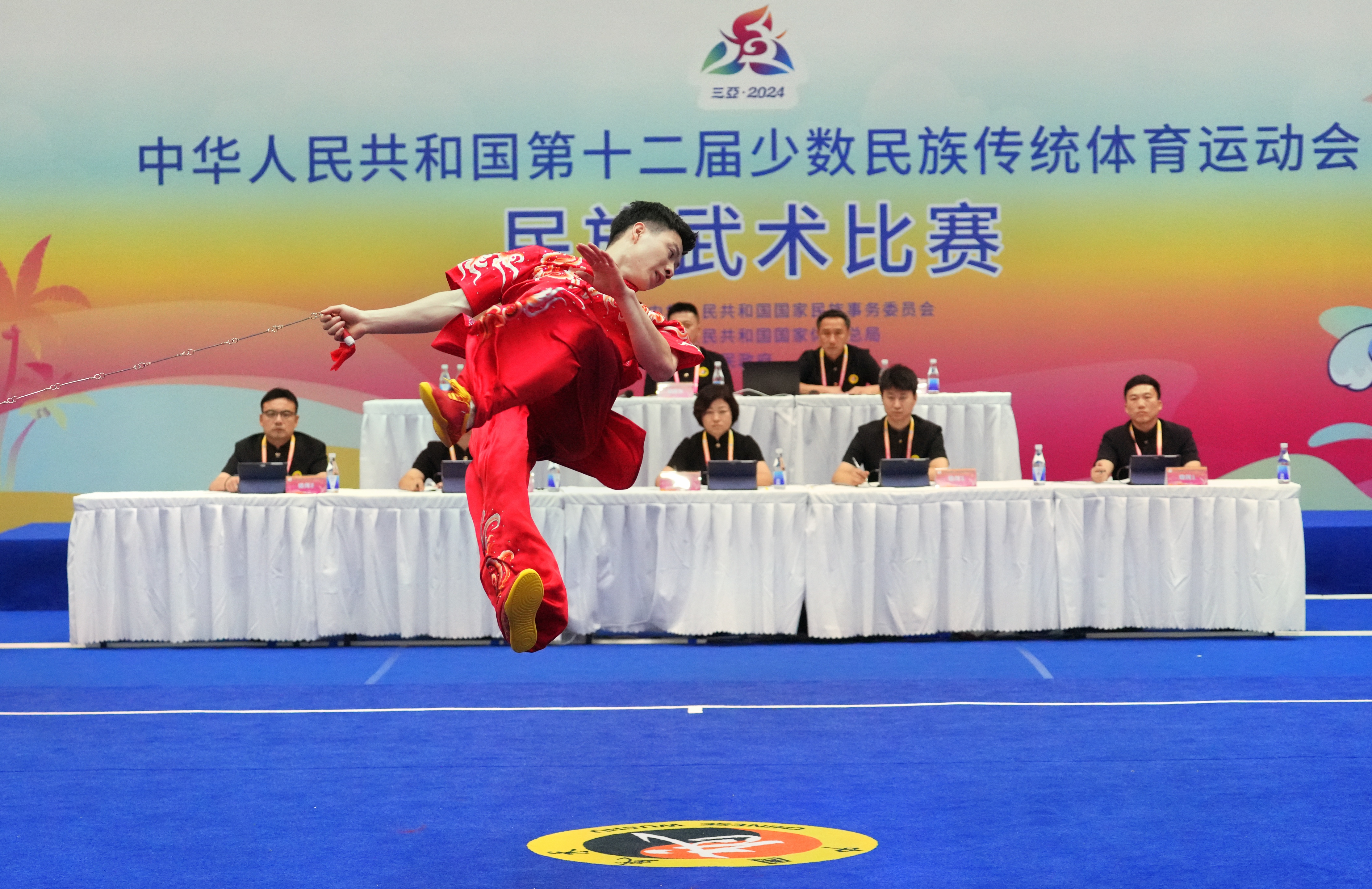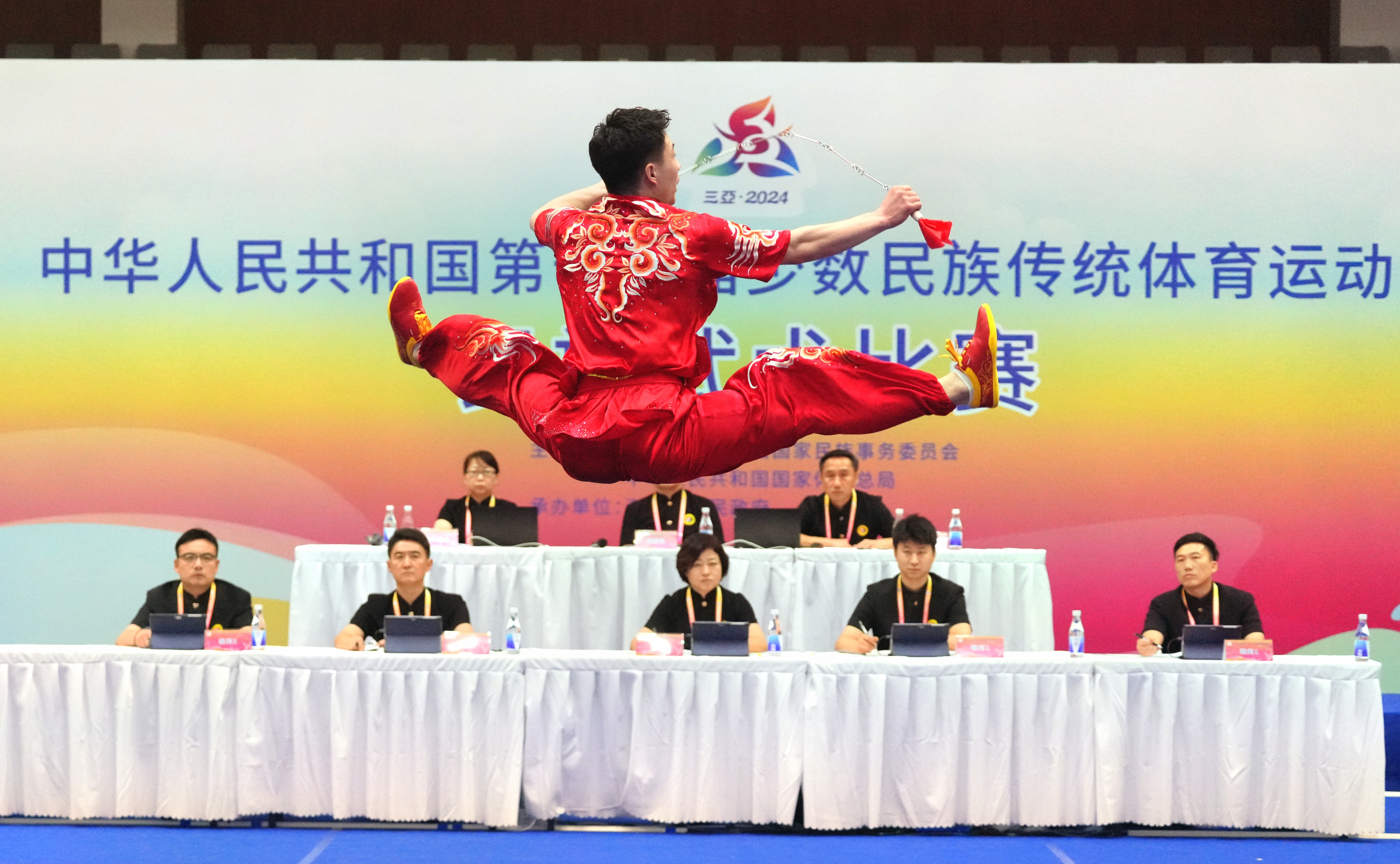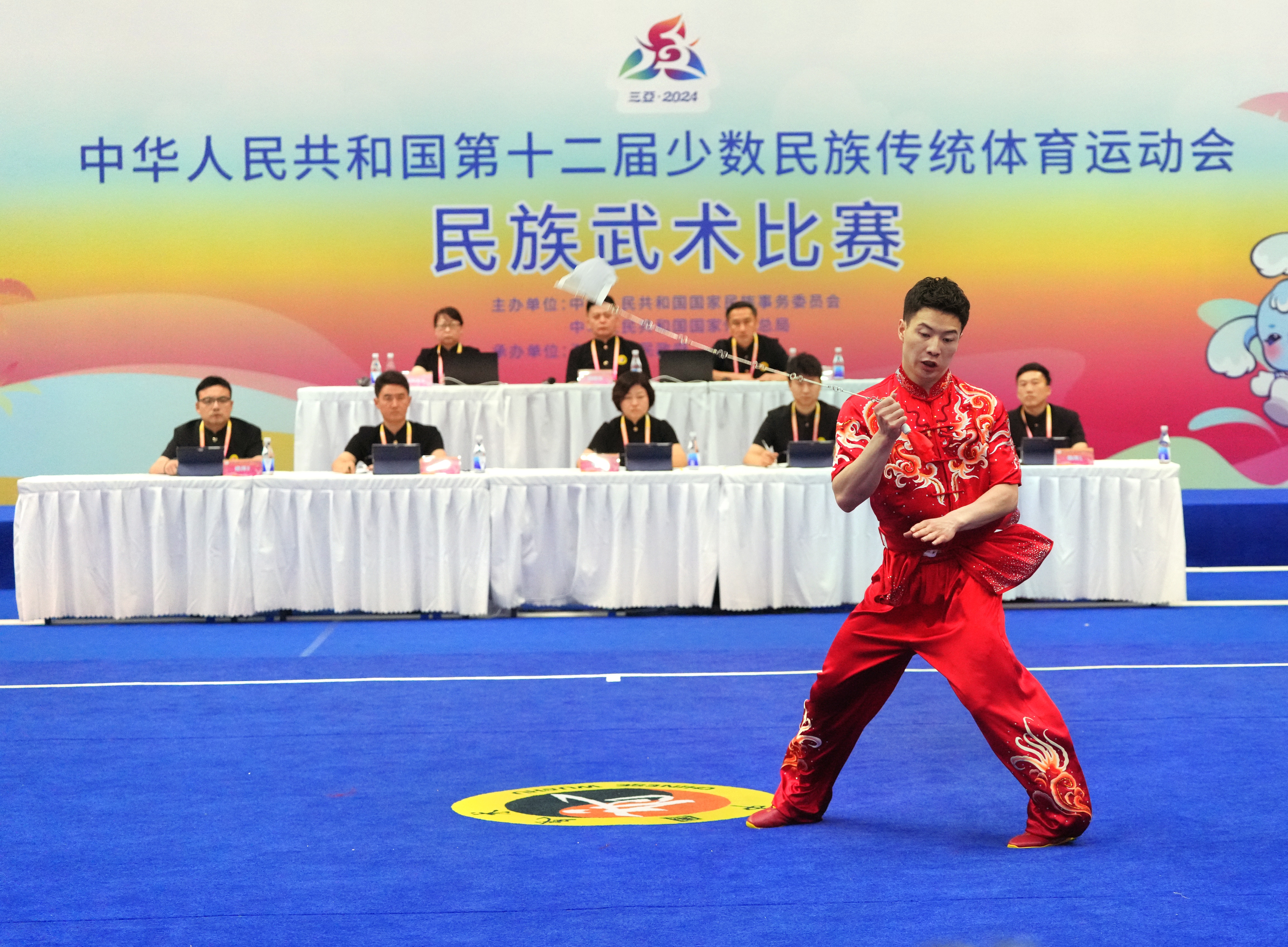 11月25日上午,第十二届全国少数民族传统体育运动会民族武术比赛场。来自北京代表团的董升在民族武术男子传统软器械决赛中以9.31分名列榜首,获得一等奖。