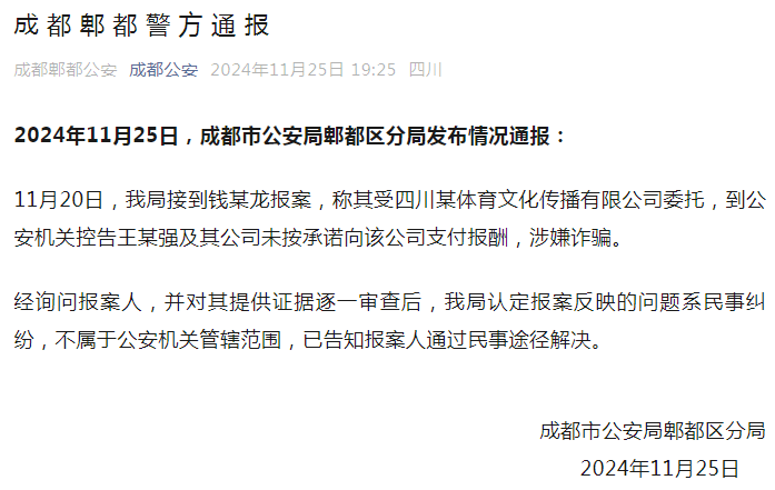 2024年11月25日,成都市公安局郫都区分局发布情况通报: