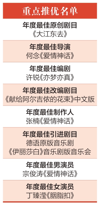 盛典晚会上,推优结果正式揭晓。本届盛典年度推优共计收到87个剧目推优报名、115个个人推优报名,共设置两大类21项荣誉,其中17项为专家评审,包括“年度最佳引进剧目”“年度最佳改编剧目”“年度最佳原创剧目”“年度最佳男演员”“年度最佳女演员”“年度最佳制作人”等。其中,“年度最佳引进剧目”花落德语原版音乐剧《伊丽莎白》音乐剧版音乐会,“年度最佳改编剧目”为《献给阿尔吉侬的花束》中文版,“年度最佳原创剧目”为《大江东去》。