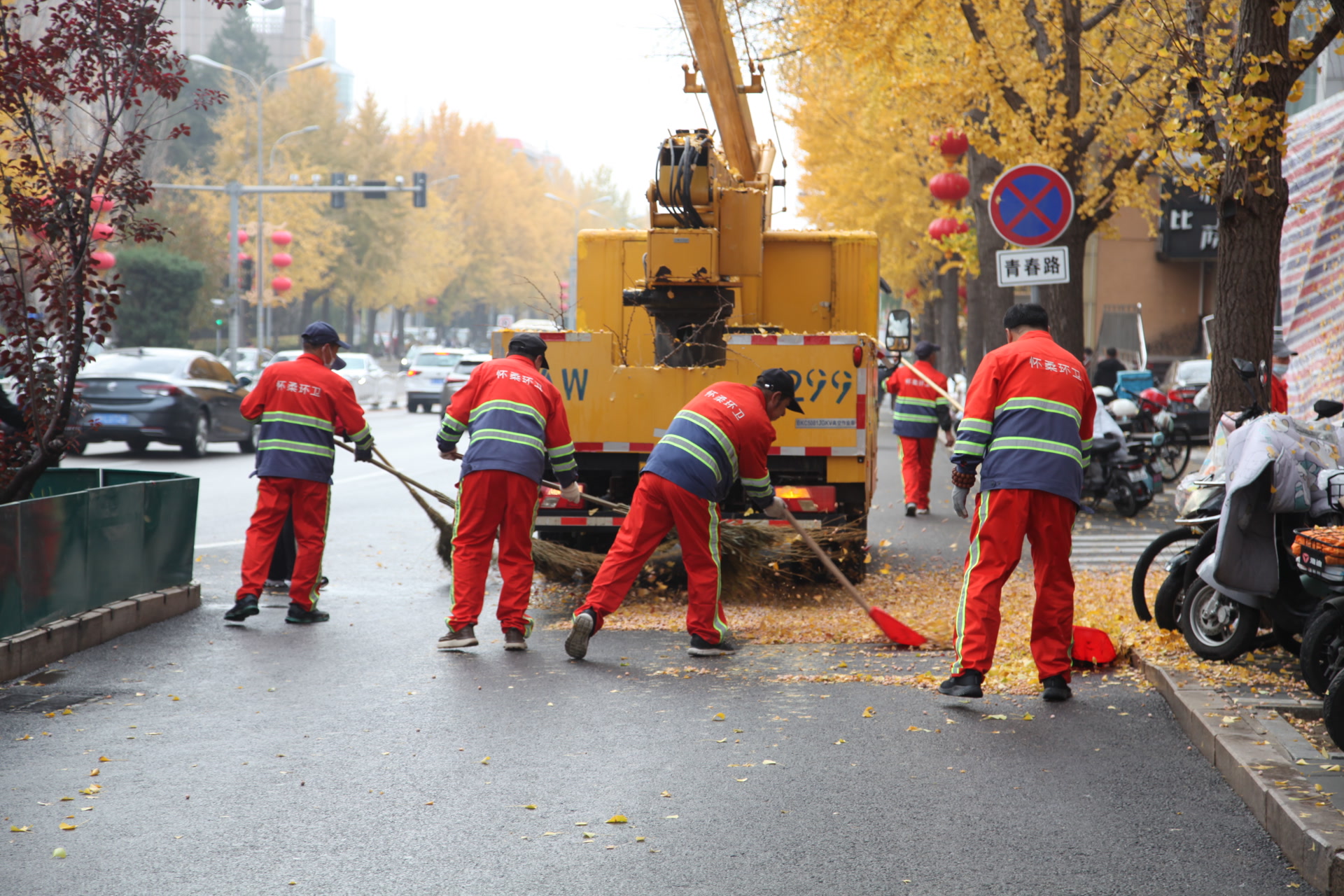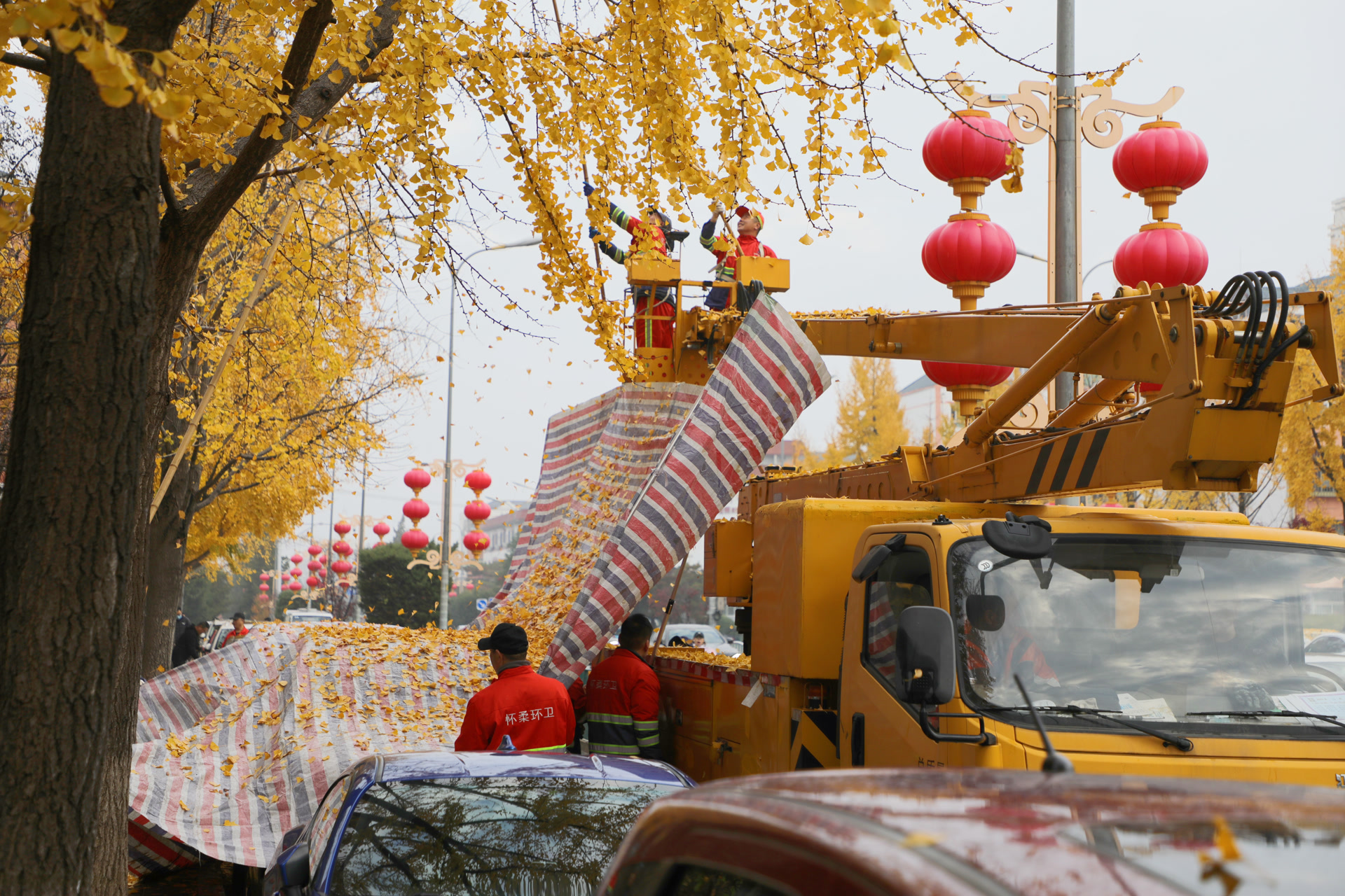上午8时,怀柔区环卫公司清洁三队与公司机关职工70余人,在青春路两侧展开了大规模的银杏果集中清理收集行动。维护秩序的环卫人员身着醒目制服,手持指挥棒,在现场有条不紊地疏导交通。高空作业组的清理工作堪称一场“高空大作战”,他们乘坐升降车缓缓升至银杏树的树冠附近,手持特制工具,小心翼翼地将枝头成熟的银杏果逐一钩落。随着银杏果簌簌落下。这时工作人员提前准备的大块苫布派上了用场,他们用苫布将停放在树下的车辆进行了周全的遮挡,防止掉落的银杏果砸伤车体。