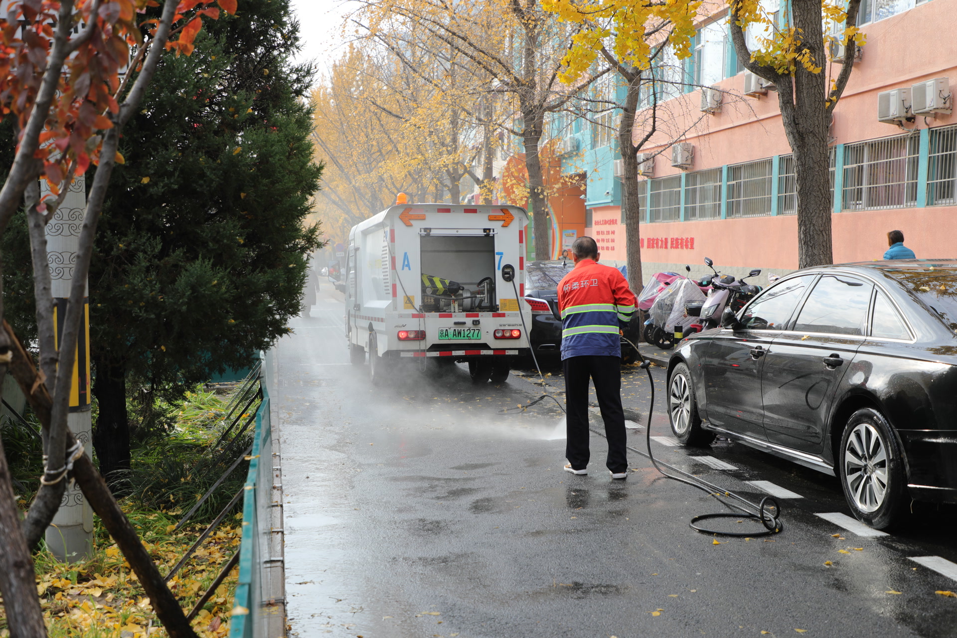 负责集中清理的工作人员则采用高压水枪对地面进行深度清理。冲洗车行驶在前,环卫人员手持高压水枪,强劲的水流冲向地面,将黏附在非机动车道和人行步道上的银杏果残渣冲散。水枪所到之处,污渍被彻底清除,道路重现洁净本色。其他人手持扫帚,紧随其后,将冲散的银杏果和落叶等扫至路边,再用垃圾收集车统一清运。
