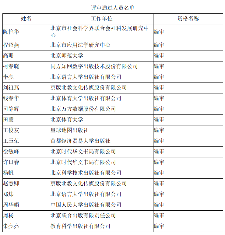 北京市出版系列高级(正高级)专业技术资格评审委员会于2024年11月15日召开会议,陈艳华等19人(名单附后)通过了编审专业技术资格评审。根据《北京市职称评审管理暂行办法》(京人社事业发〔2020〕12号)的规定,经复核,现予以公示。
