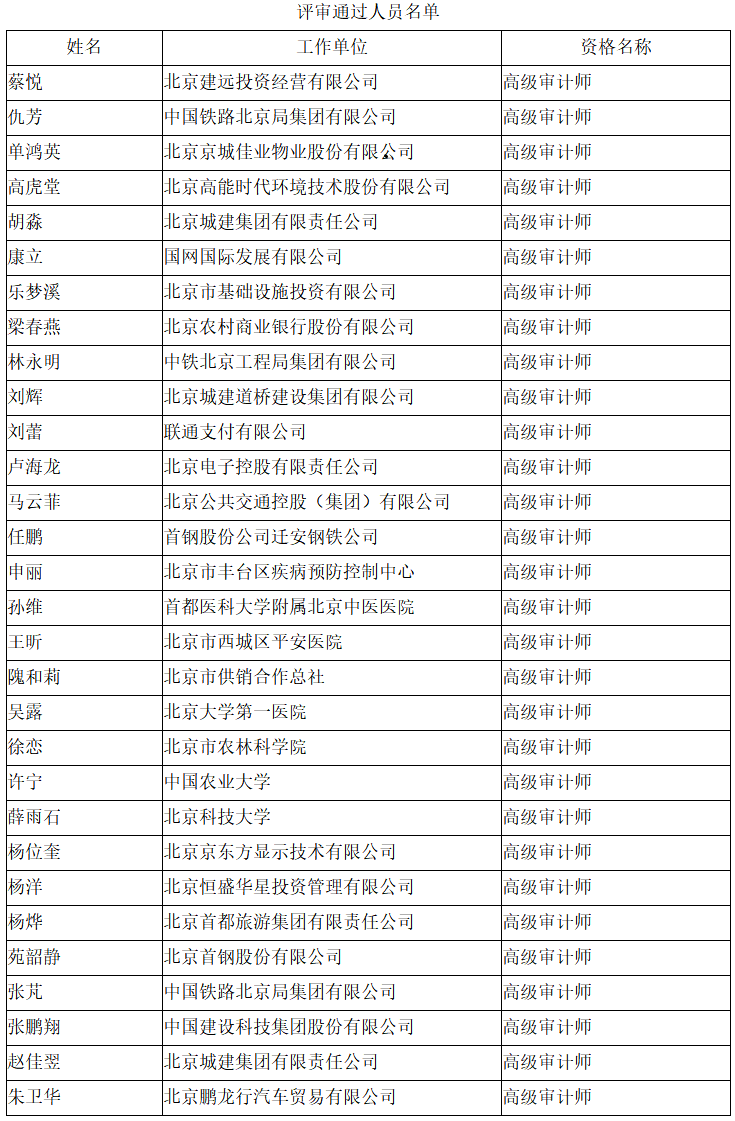 北京市审计系列高级专业技术资格评审委员会于2024年11月13日召开会议,蔡悦等30人(名单附后)通过了高级审计师专业技术资格评审。根据《北京市职称评审管理暂行办法》(京人社事业发〔2020〕12号)的规定,经复核,现予以公示。