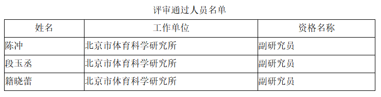 北京市自然科学研究系列(体育科研)高级专业技术资格评审委员会于2024年11月12日召开会议,陈冲等3人(名单附后)通过了副研究员专业技术资格评审。根据《北京市职称评审管理暂行办法》(京人社事业发〔2020〕12号)的规定,经复核,现予以公示。