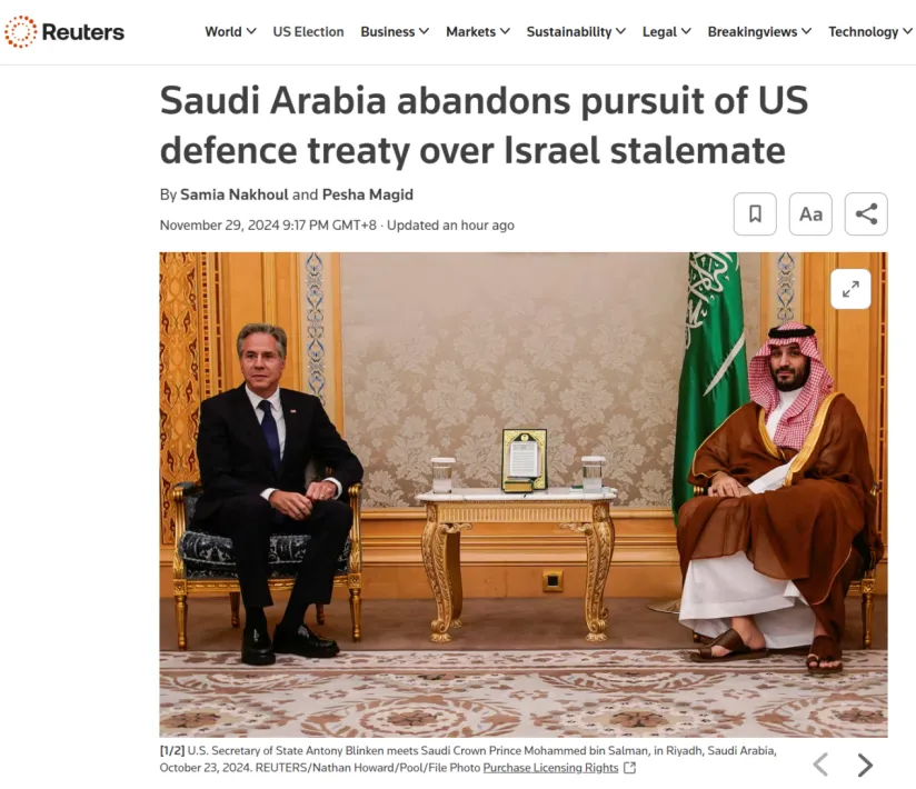 但路透社在11月29日的报道中援引2名沙特官员和4名西方官员的消息称,沙特最终放弃了与美国签署这一“激进”的协议,目前双方正推动达成一项更适度的军事合作协议。