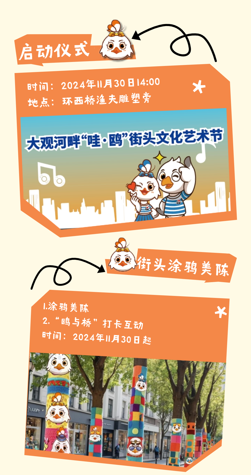 据介绍,在9天的活动中,街头涂鸦美陈、主题歌舞、“哇·鸥”集市、河畔写生、街头音乐会、古船演艺、无人机展示、故事征集、鸥遇运动、打卡集章等十大主题活动将陆续呈现。