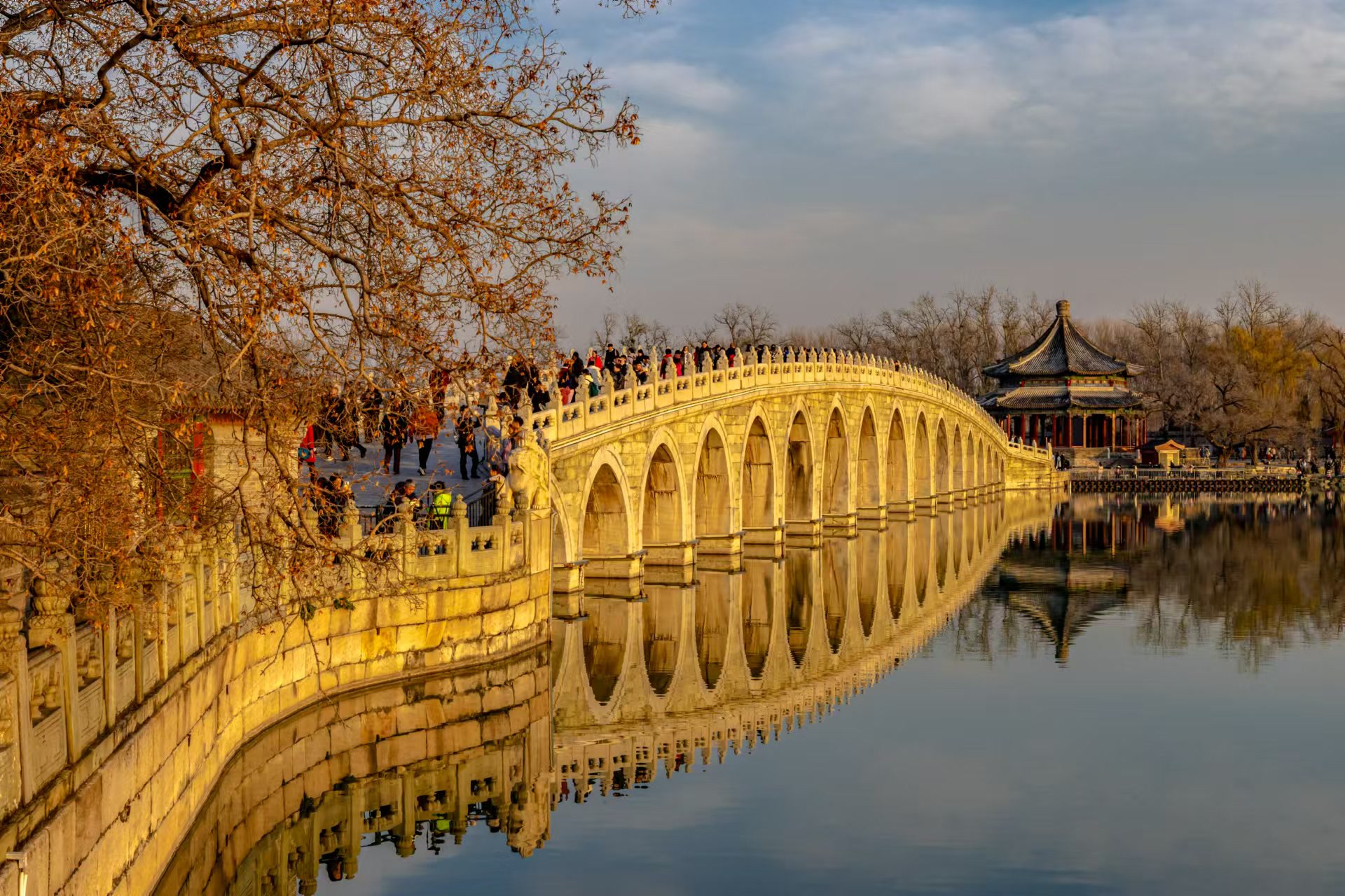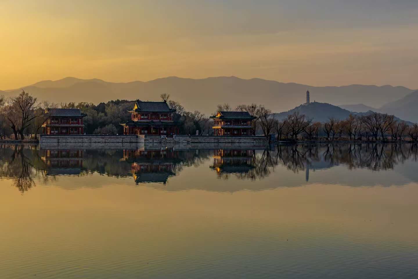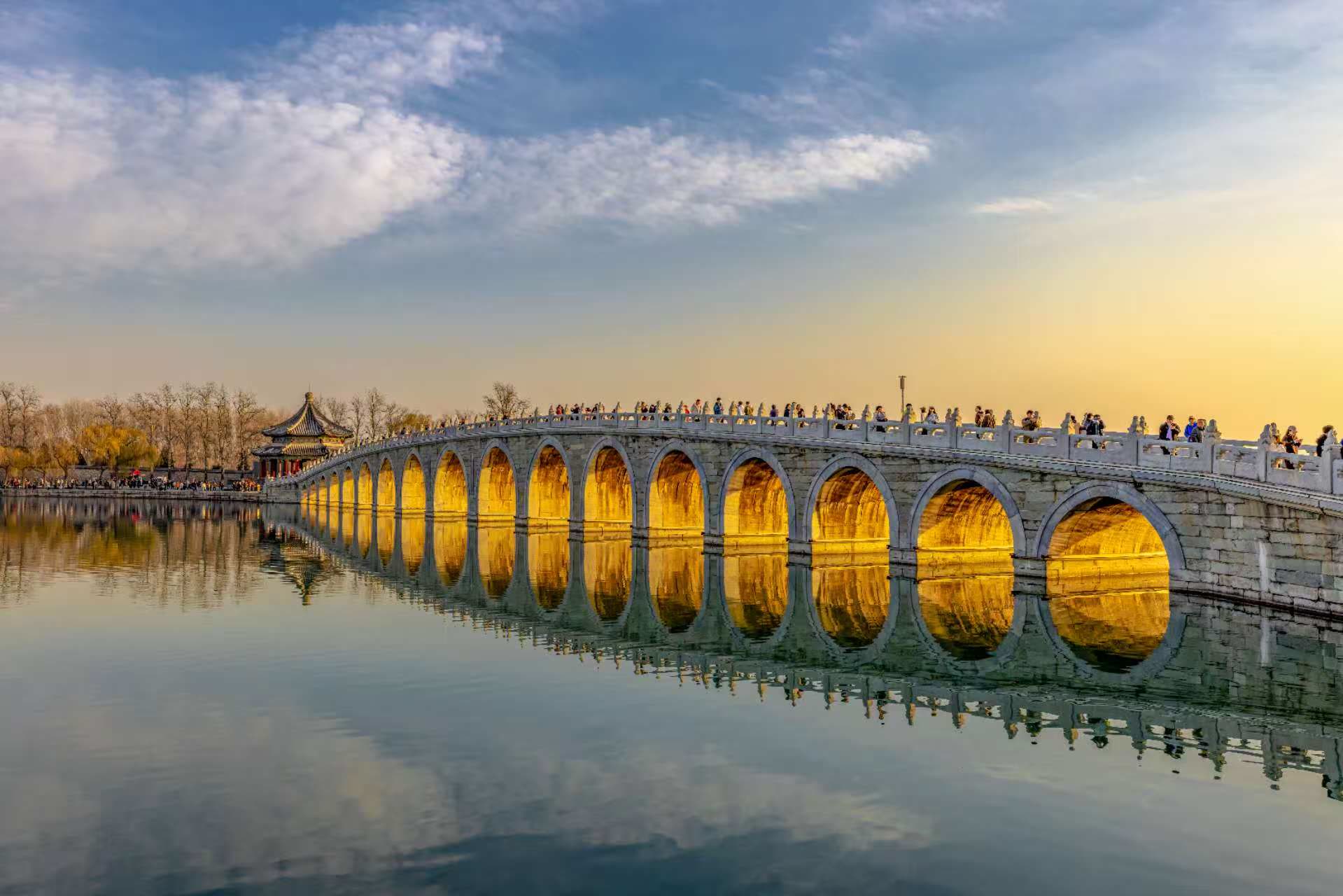 12月1日傍晚,北京冬日的颐和园出现“金光穿洞”景观,古老的十七孔桥与湖水相映成辉,仿佛进入了一幅流动的画卷。