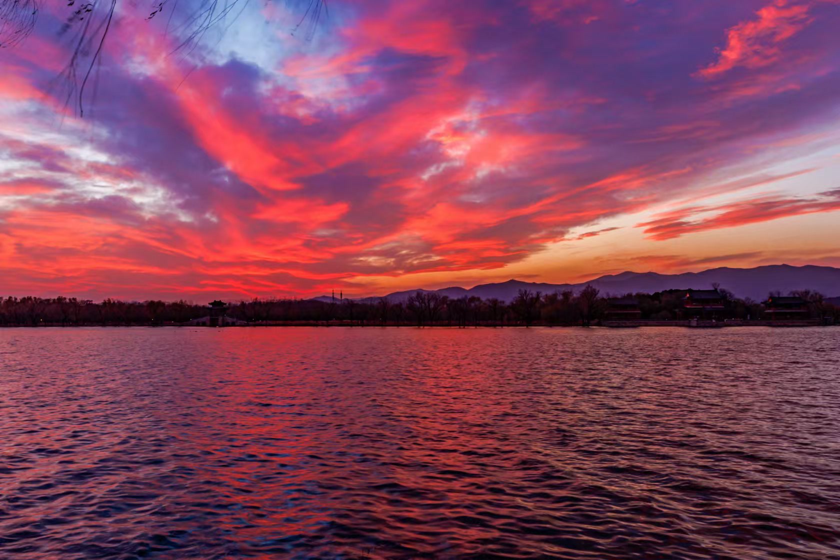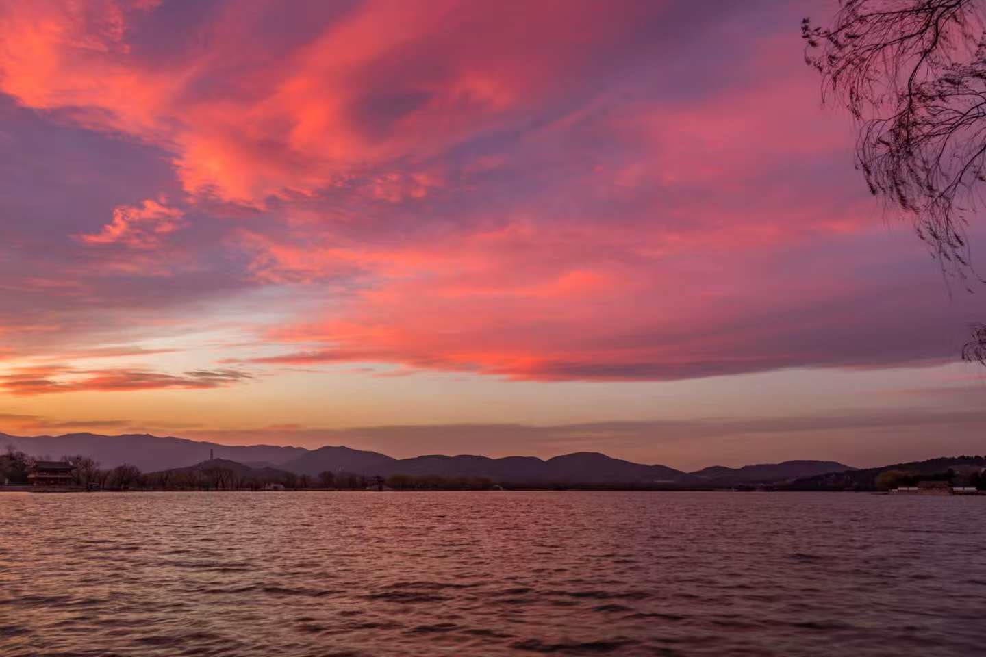 随着夕阳落下,天空出现绚丽晚霞,静谧与壮丽交织,美不胜收。
