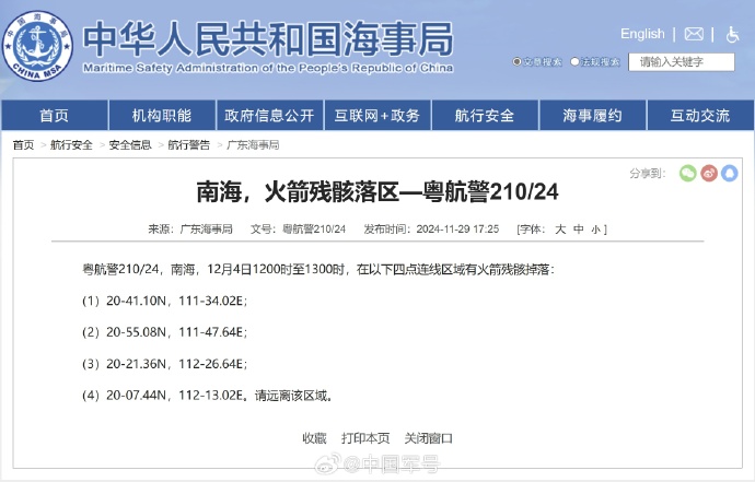 广东海事局发布航行警告,12月4日12时至13时,南海部分海域有火箭残骸掉落,请远离该区域。