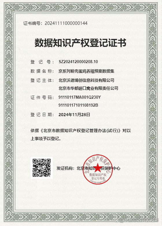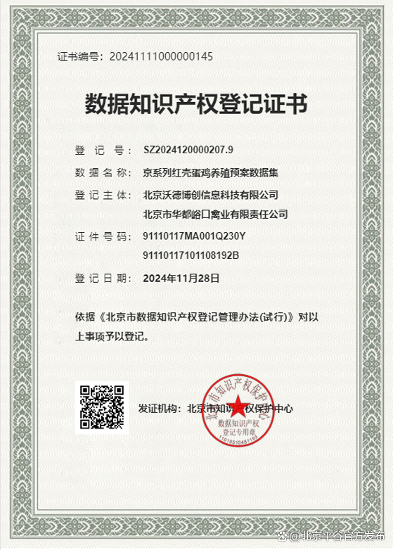 11月28日,平谷农业中关村核心企业北京沃德博创信息科技有限公司(简称“沃德博创”)和北京市华都峪口禽业有限责任公司(简称“峪口禽业”)联合申请的“京系列红壳蛋鸡养殖预案数据集”“京系列粉壳蛋鸡养殖预案数据集”“京系列白壳蛋鸡养殖预案数据集”,成功取得北京市知识产权保护中心签发的《数据知识产权登记证书》,是平谷农业中关村、也是国内家禽行业首批《数据知识产权登记证书》。