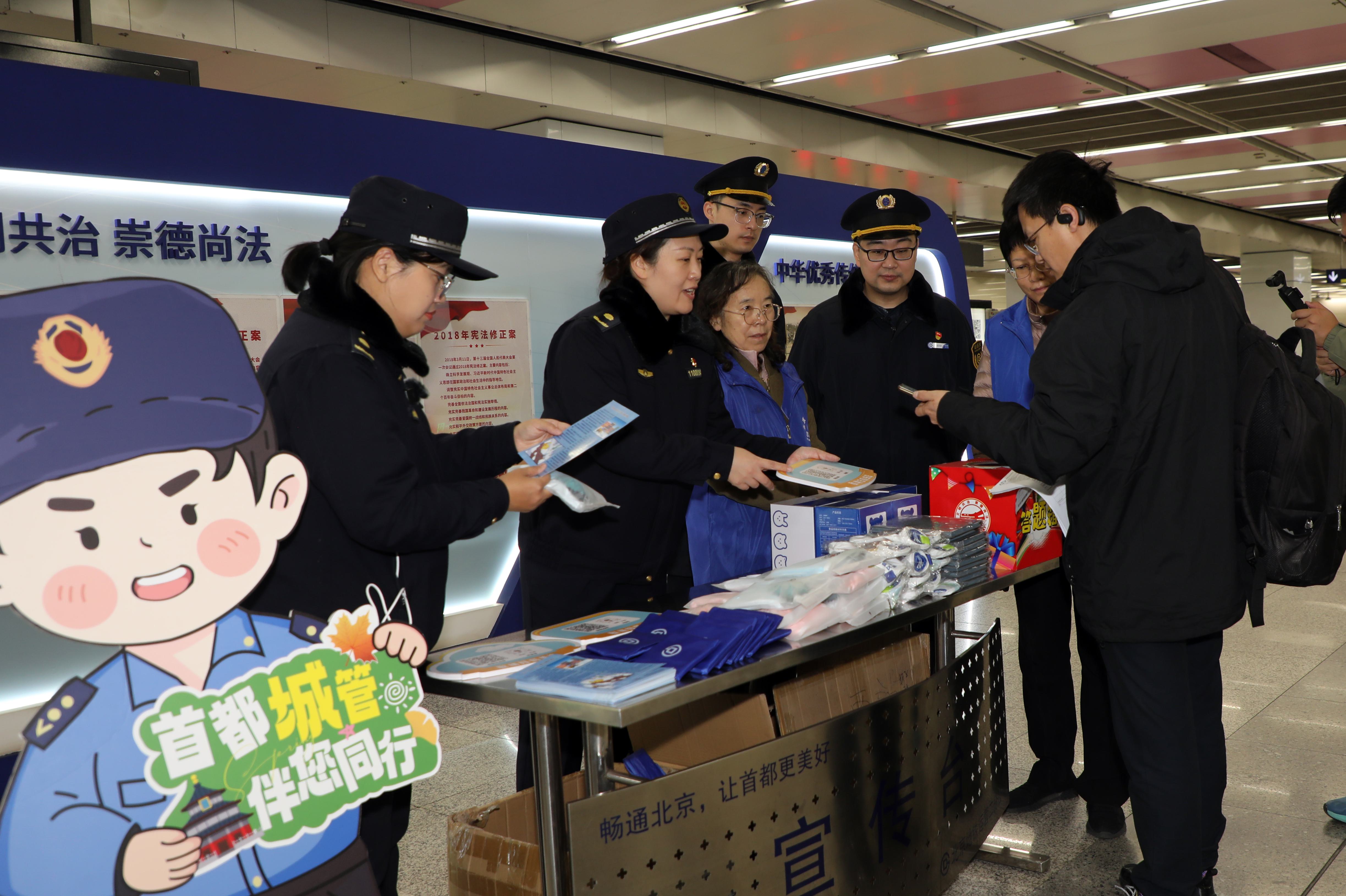 在地铁9号线白石桥南站,市城管执法局联合市地铁运营公司,面向乘客宣传宪法知识和城市管理方面法律法规。同时,就废弃电动自行车清理、扫雪铲冰等问题开展社会宣传和动员,引导乘客履行相关法律义务,营造了浓厚的法治社会氛围。