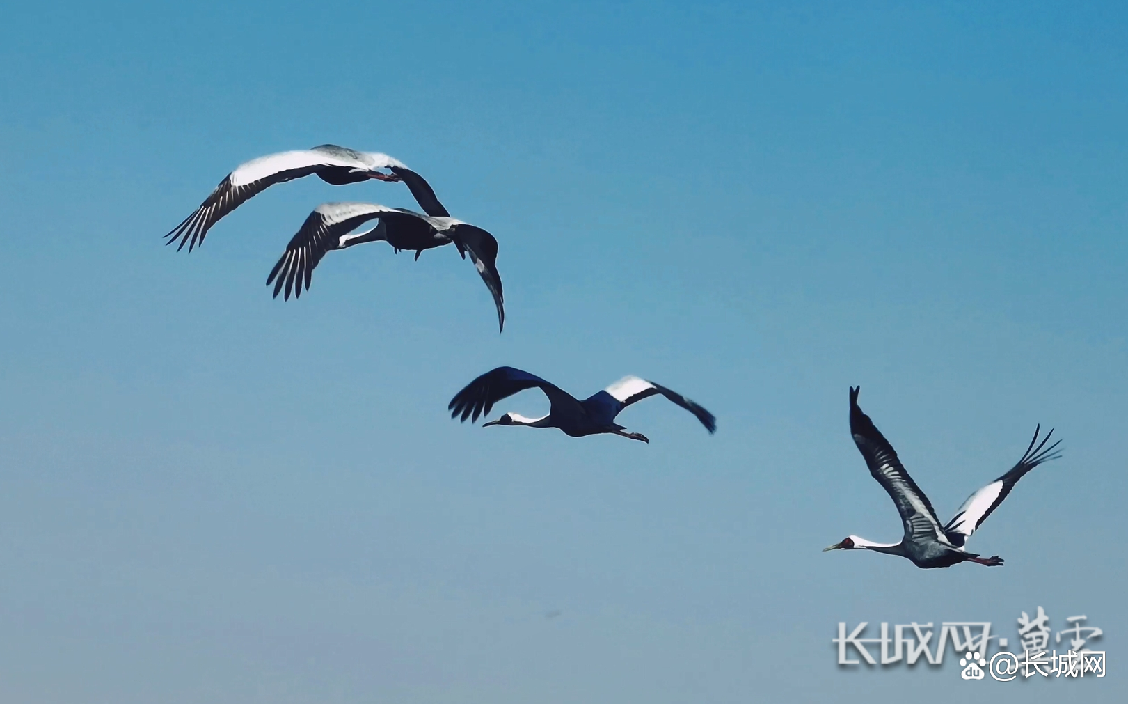 白枕鹤在海兴湿地和鸟类省级自然保护区上空飞翔。刘洪睿 摄