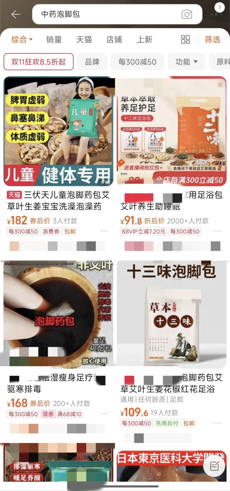 在搜索中发现,网上售卖的这些中药植物泡脚包的“配方”非常多,除了常见的驱寒助眠外,甚至还有宣传能排毒补肾。