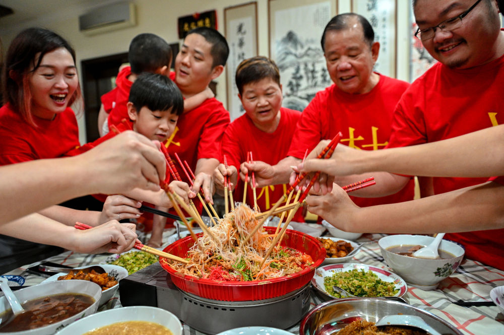 说到马来西亚的春节,就不得不提当地华人的“捞生”习俗——一个大圆盘里,鱼生为主材,搭配生菜丝、芹菜丝、胡萝卜丝、黄瓜丝、紫包菜等色泽丰富的配菜,再配上白芝麻、花生碎、酸甜酱等调味,多人围桌而立,一起用筷子反复把食材高高“捞”起,同时还不停喊着“身体健康、万事如意、财源广进”等吉祥话。在粤语里,“生”与“升”谐音,越捞越“升”,是对新的一年美好的祝愿。