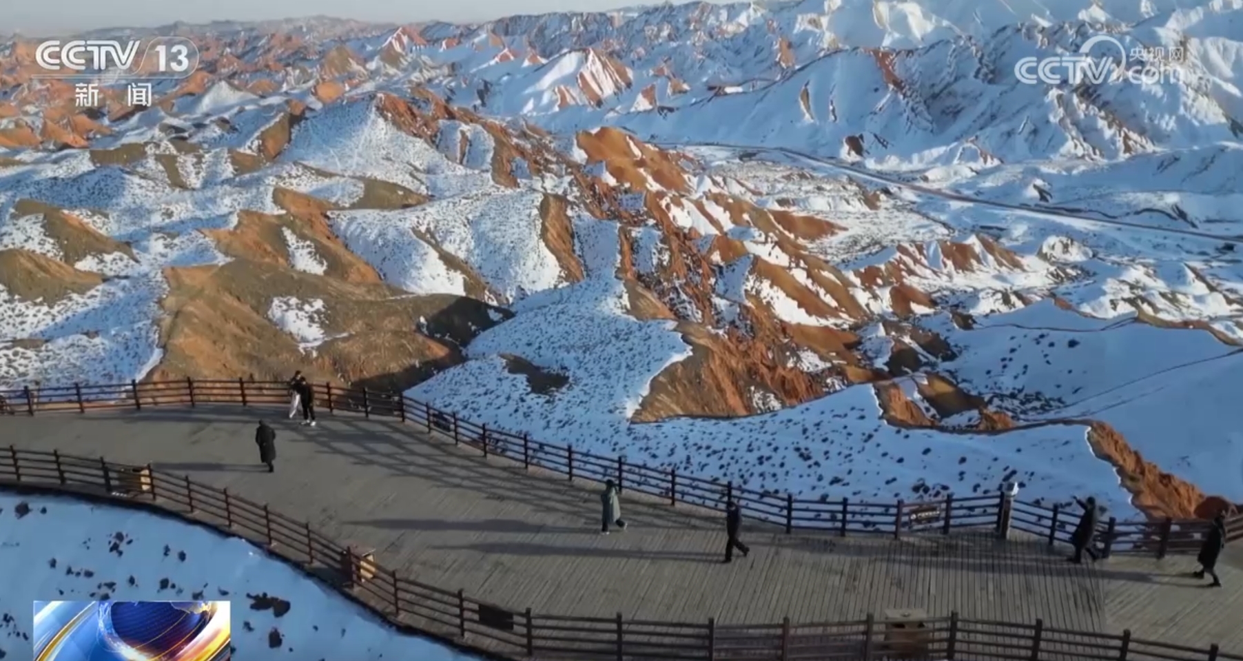 近日,在甘肃张掖,降雪后的七彩丹霞景区展现出别样的风姿与神韵,吸引了不少游客前来观赏。