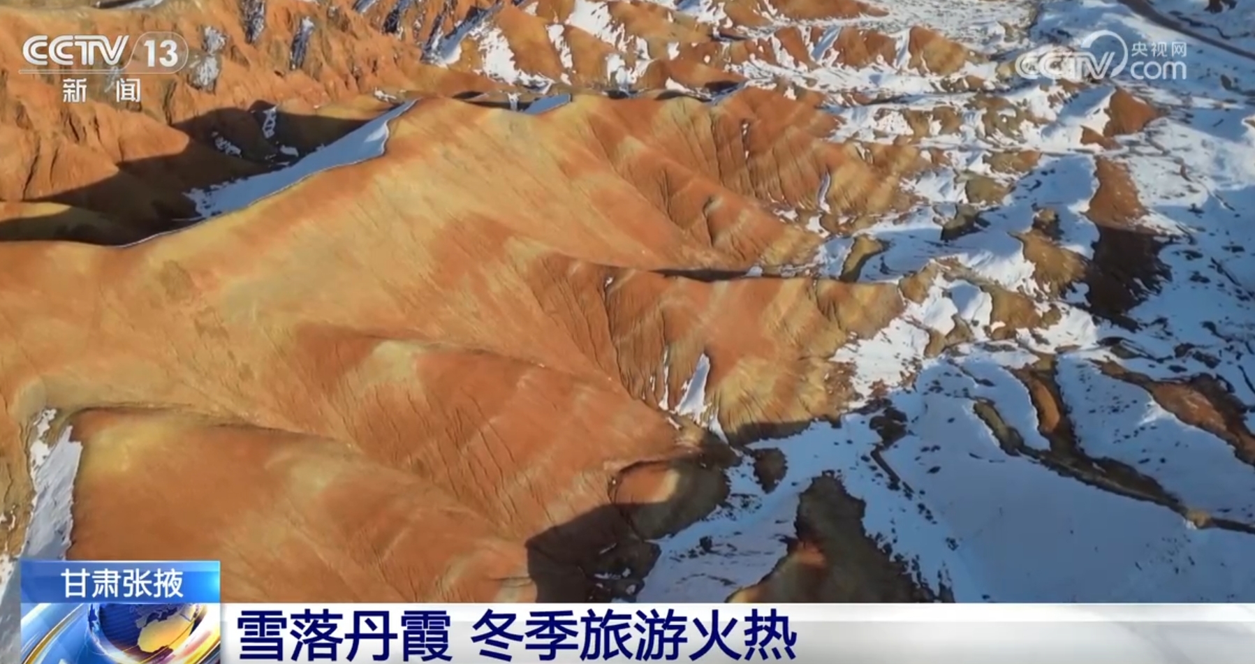 从空中俯瞰,洁白的雪覆盖在七彩丹霞的斑斓岩层之上,二者相互交织,形成了一种强烈对比的视觉美感。绚丽夺目的红、黄等色彩在白雪的点缀与烘托下,愈发显得鲜艳明丽、层次丰富。